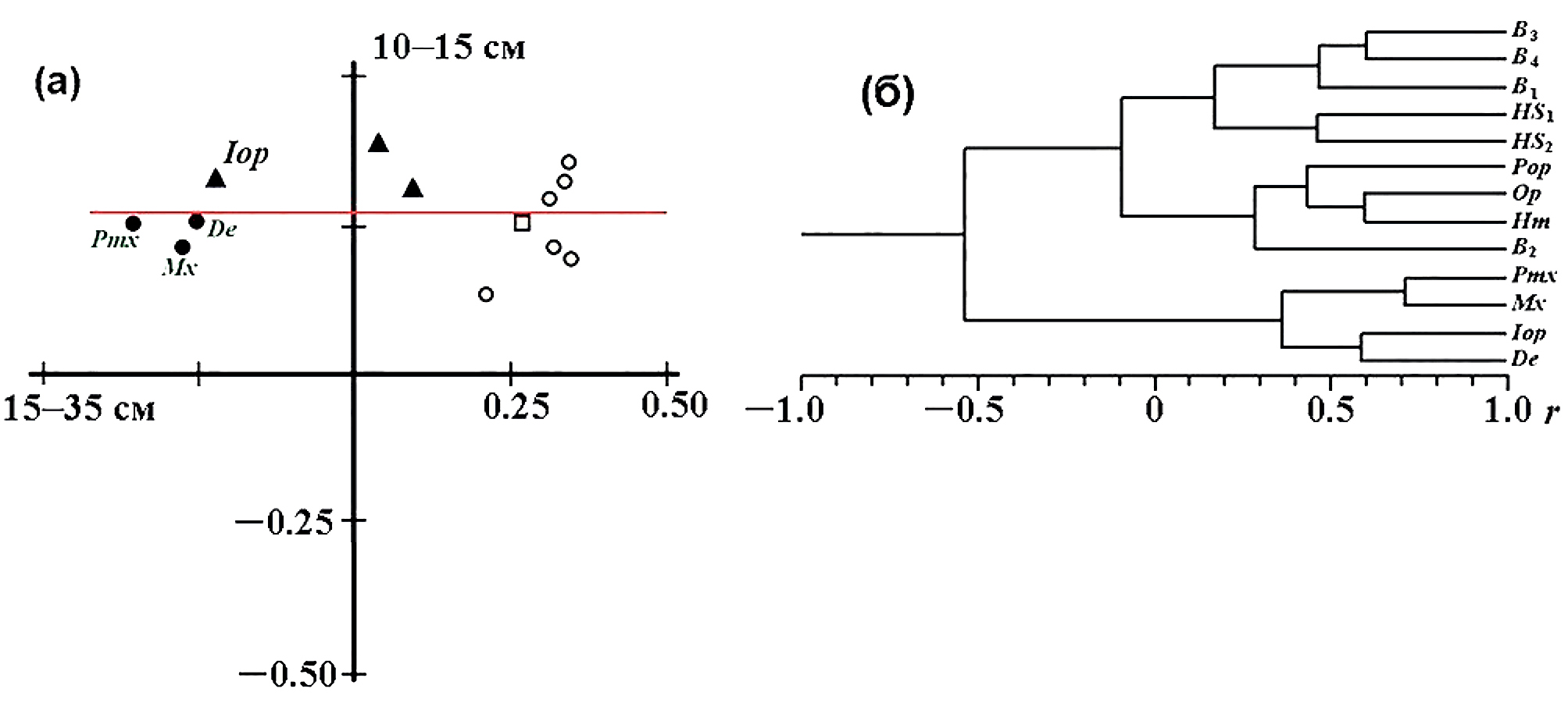 Рис. 2. Особенности изменчивости особей генерализованной формы усачей комплекса Barbus intermedius в размерных группах (SL) 10–15 и 15–35 см: а – сравнение собственных векторов (СВ1), rS = 0.06, p = 0.86; б – дендрограмма сходства признаков в группе особей SL 15–35 см. Параметры челюстной дуги (●): Pmx, Mx, De; жаберной крышки (▲): Pop, Op, Iop; нейрокраниума (○): B1, B2, B3, B4, HS1, HS2; гиоидной дуги (□): Hm. Ост. обозначения см. на рис. 1. Здесь и на рис. 3, 4: параметры обозначены символами и надписями строго в той мере, в какой это необходимо для понимания изложения.