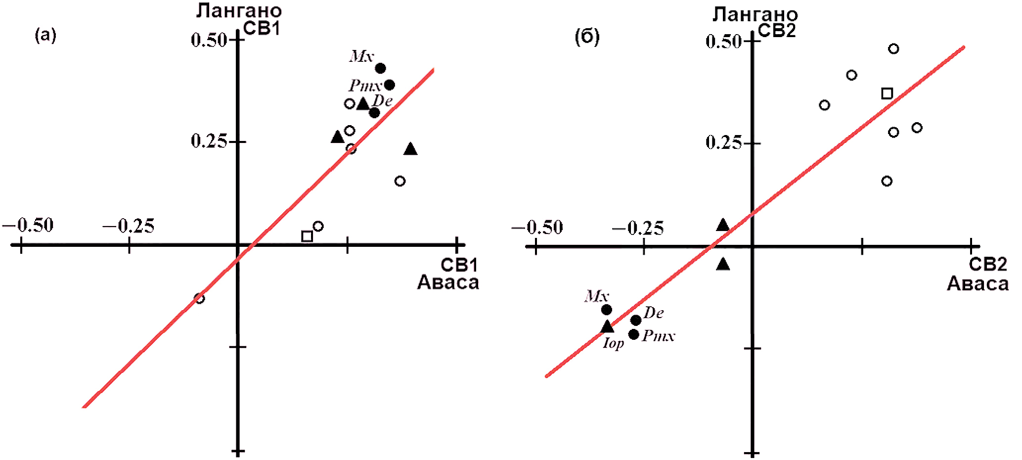 Рис. 3. Сравнение собственных векторов (СВ) дисперсии особей генерализованной формы усачей комплекса Barbus intermedius из оз. Лангано и Аваса: а – СВ1 и СВ1, rS = 0.47, p > 0.05; б – СВ2 и СВ2, rS = 0.75, p < 0.005. Здесь и на рис. 4: символьные обозначения нагрузок параметров идентичны обозначениям параметров на рис. 2, ост. обозначения см. на рис. 1.