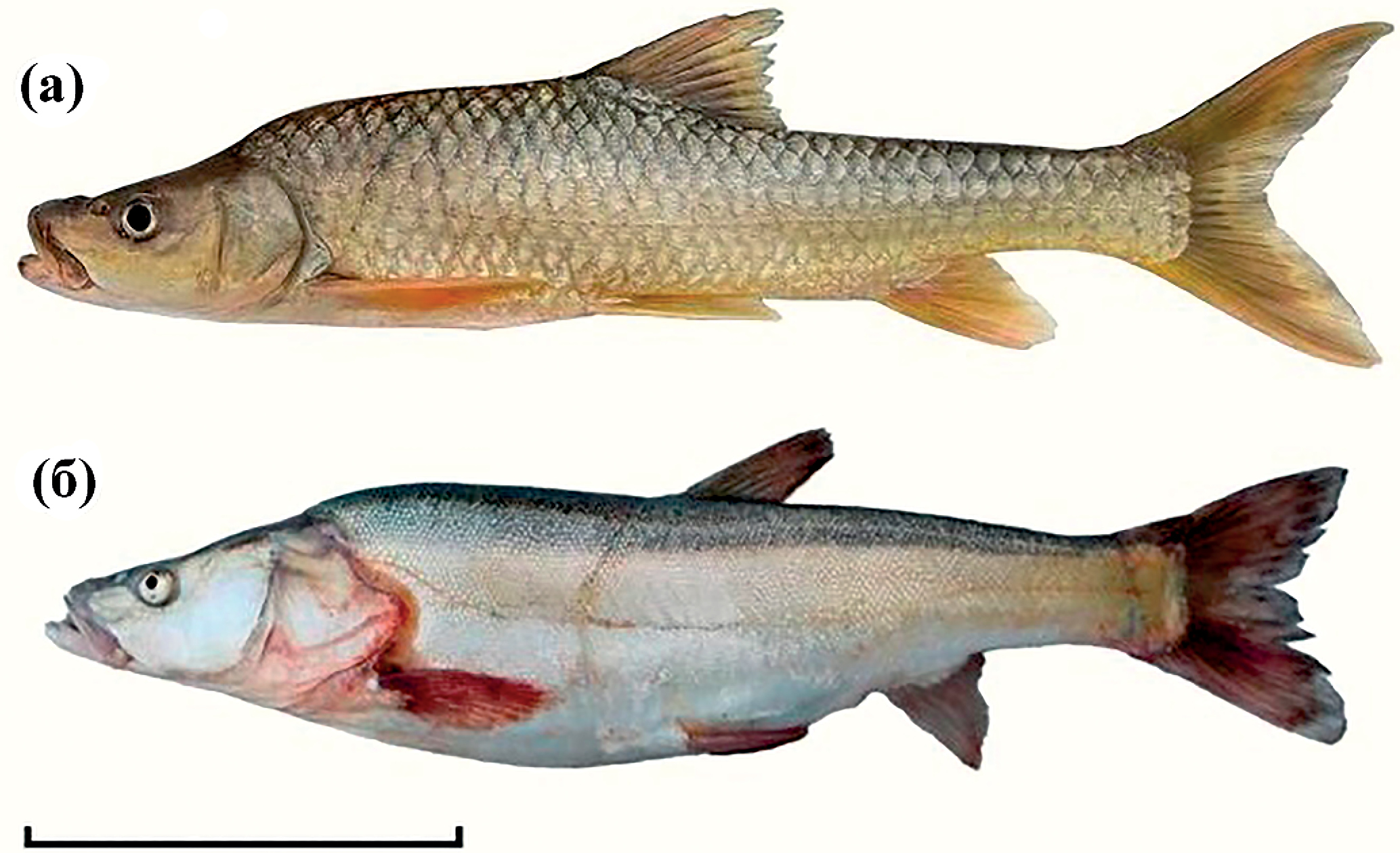 Рис. 6. Представители рыбоядных форм усачей комплекса Barbus intermedius оз. Тана и алтайского османа Oreoleuciscus humilis оз. Орог: а – морфотип bigmouth small-eye (название по: Nagelkerke et al., 1994), б – озёрная форма османа. Масштаб (линейка общая): 10 см.