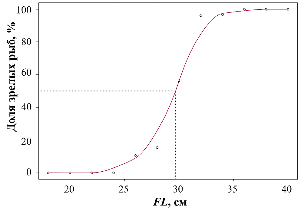 При FL до 24 см все особи были неполовозрелыми, первые рыбы с созревающими гонадами были отмечены при длине 25 см, в размерных классах от 25 см доля половозрелых рыб росла и достигла 50% при FL ~30 см. Все особи были половозрелыми при FL 35 см и более (рис. 4).