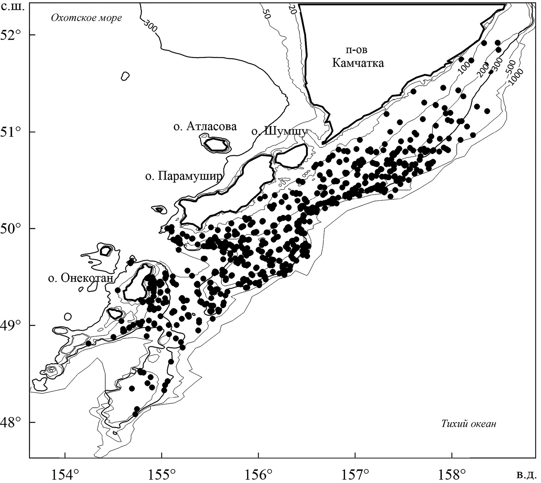 Двухлинейная камбала была широко распределена от самого прибрежья до глубины преимущественно 300 м (рис. 14г). Судя по батиметрическому распределению, вид осуществлял миграцию на зимовальные участки, главный из которых находился у Юго-Восточной Камчатки. Интересно прибрежное местоположение части рыб у Первого Курильского пролива, в прибрежной зоне о-ва Шумшу.