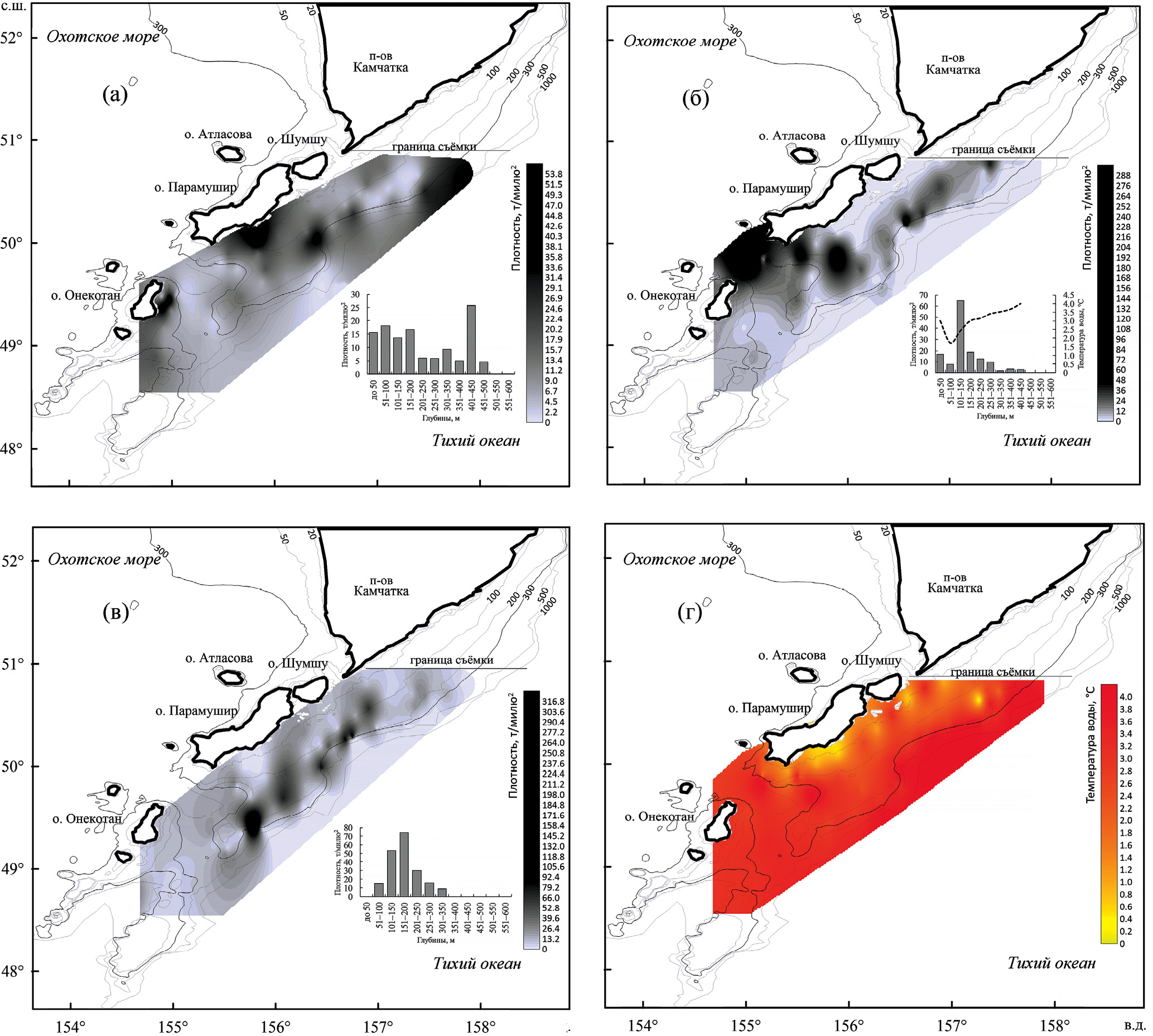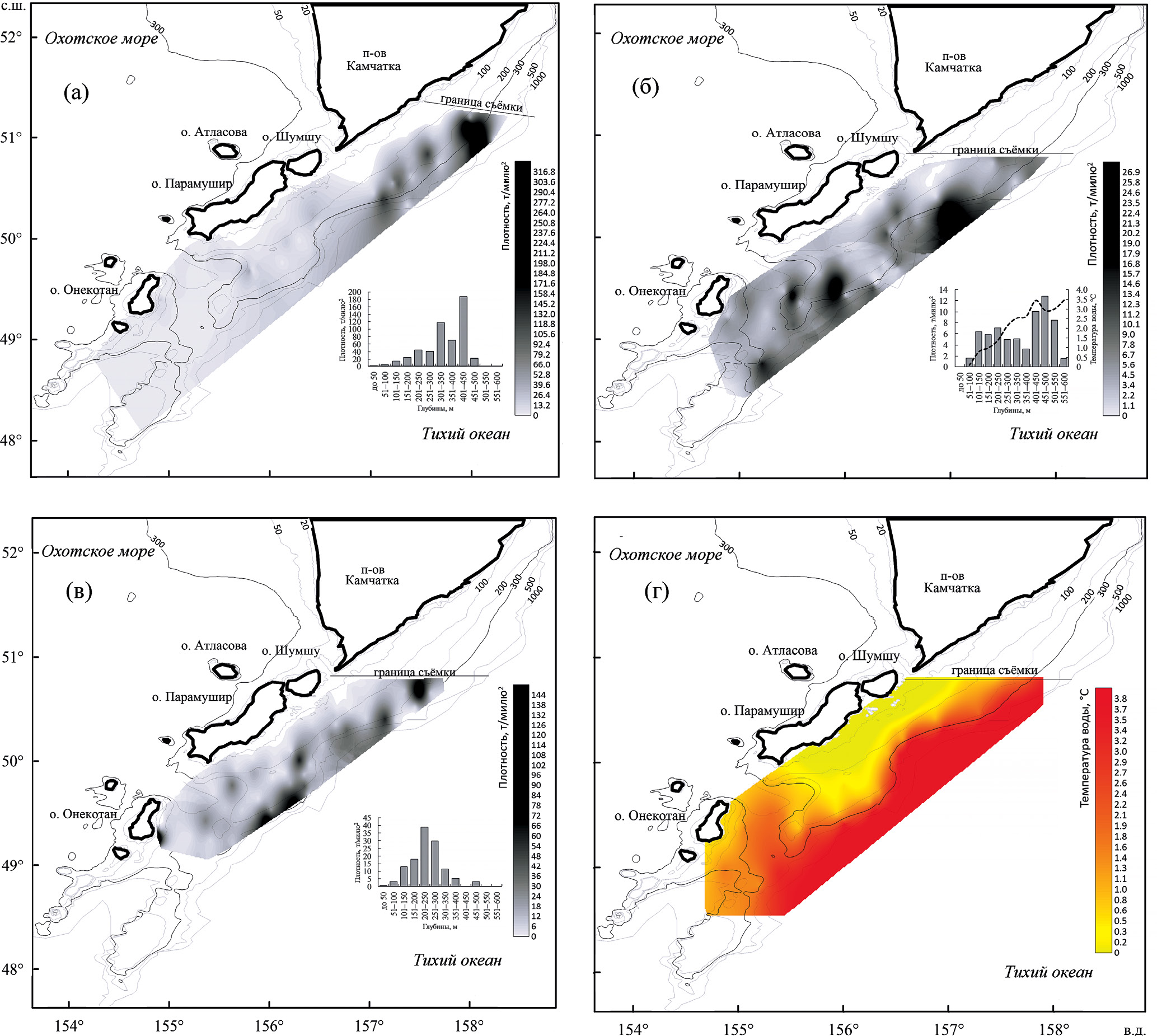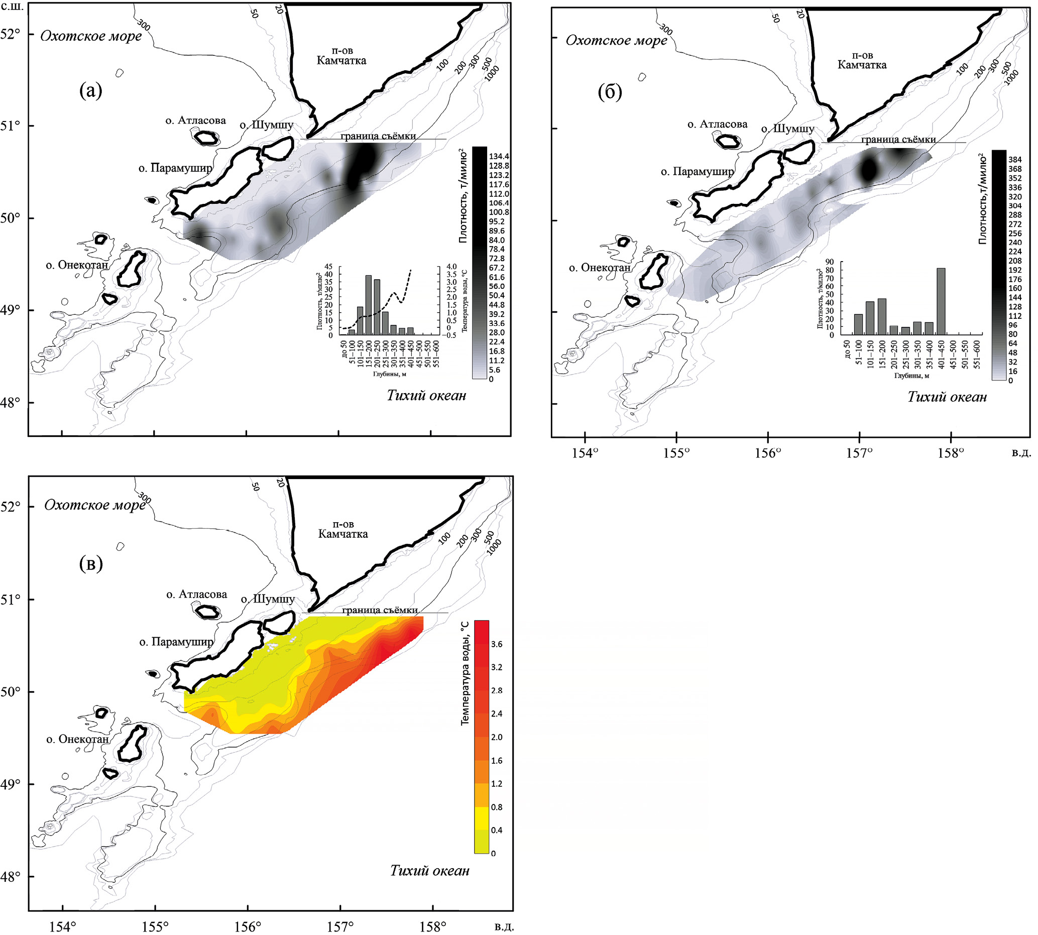 В зимний период, в январе–марте, на тихоокеанском склоне у северных Курильских островов и Юго-Восточной Камчатки выделяется единая обширная зона зимовки рыб. Её местоположение в указанном районе впервые было отчётливо продемонстрировано исследованиями 1987 г. на научно-промысловом судне средний рыболовный траулер морозильный “Шурша” (рис. 2а). Следует отметить, что именно в этом году была оценена важность роли склоновых вод Юго-Восточной Камчатки в формировании единого ареала обитания шельфовых видов рыб Северо-Курильского региона. В последующие годы зимние исследования осуществляли, как правило, южнее широты м. Лопатка, являющегося крайней точкой п-ова Камчатка, и показывали значительно меньшие биомассы рыб (рис. 2б, 2в). Шельфовые участки зимой характеризовались существенно более холодными водами по сравнению с континентальным склоном (рис. 2г). Прибрежная зона глубиной до 100 м охлаждалась до отрицательных значений температуры воды вплоть до –0.6°C (в среднем 0°C), тогда как температура склоновых вод составляла 0.2–1.8°C на глубинах 100–200 м, 1.4–2.9°C – на 200–500 м, а в диапазоне глубин 500–600 м достигала 3.0–3.5°C.