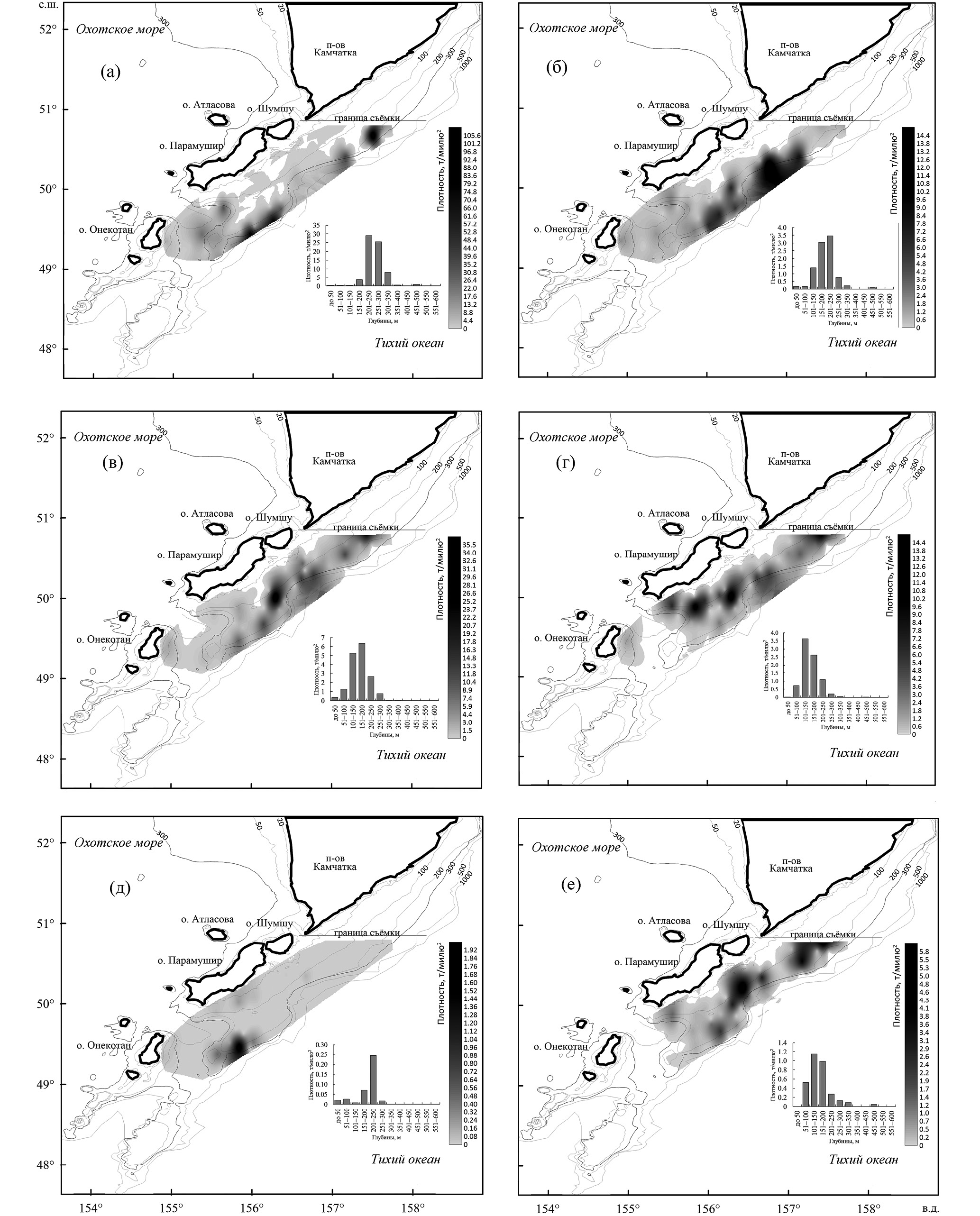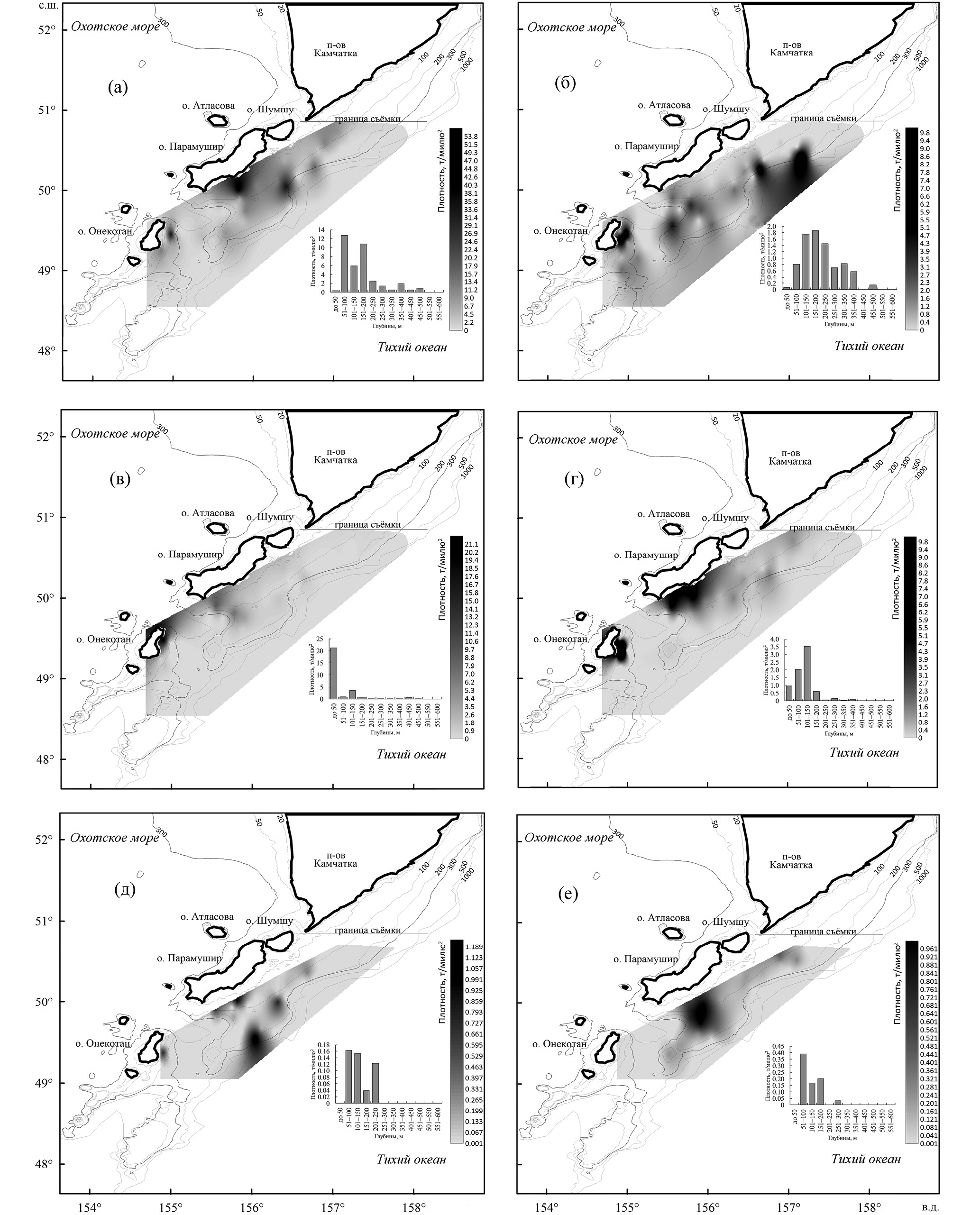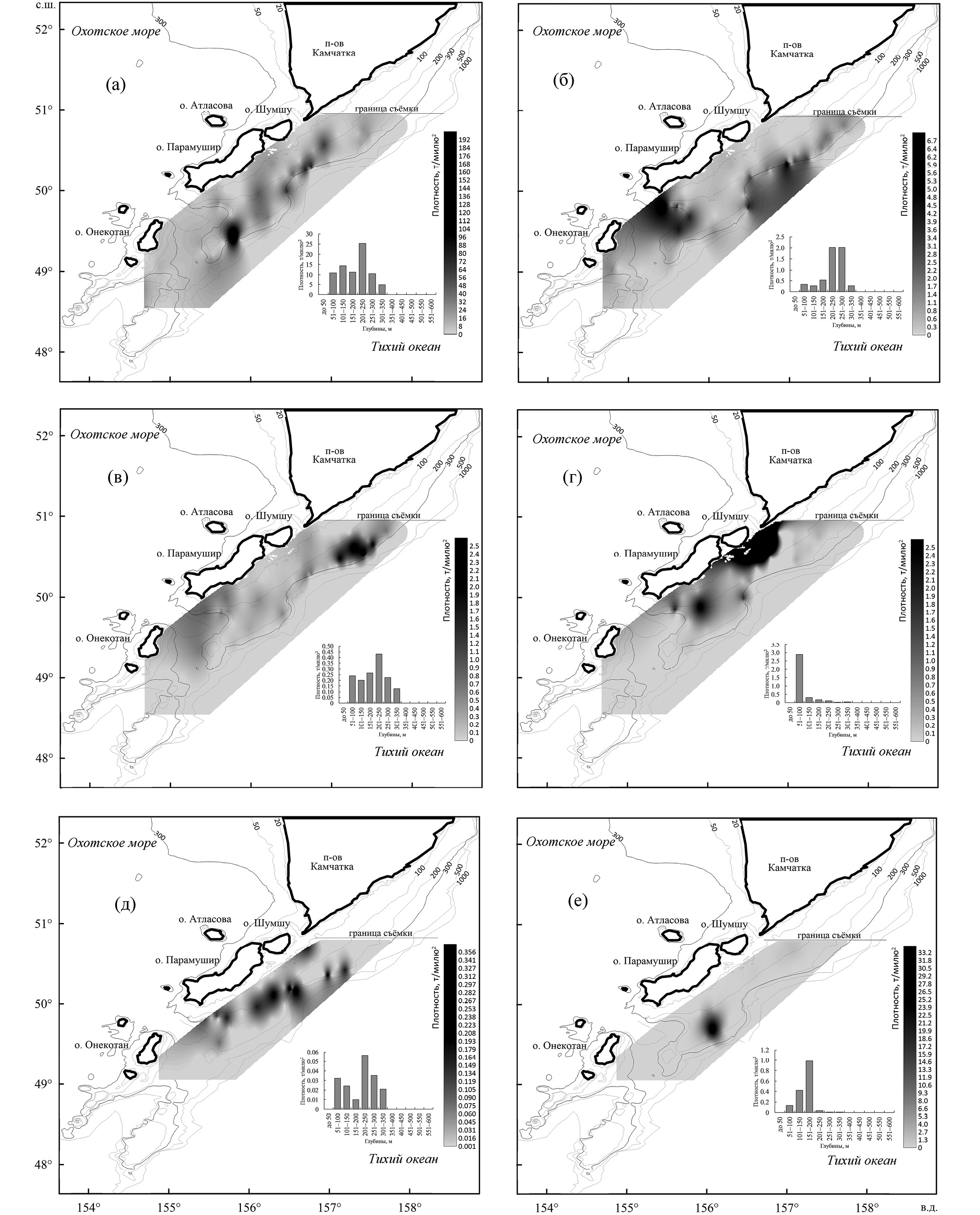 Минтай был распределён на склоне в диапазоне глубин 200–350 м (рис. 5а). Скопления вида с повышенной плотностью формировались на двух участках – на траверзе юго-восточной оконечности Камчатки, представляя край северного скопления, и на склоне выступающего плато южнее о-ва Парамушир. Треска образовывала основное скопление вдоль склона у о-вов Шумшу и Парамушир на глубинах 100–300 м (рис. 5б). Многочисленная двухлинейная камбала концентрировалась на южном плато непосредственно напротив о-ва Парамушир на глубине 100–250 м (рис. 5в). Оконтуренная часть скопления камбал на северной границе съёмки указывала на присутствие ещё одного скопления севернее 51° с. ш. у Юго-Восточной Камчатки. Белобрюхий получешуйник формировал несколько отдельных скоплений, распределённых вдоль всего о-ва Парамушир, ещё одно скопление вида было краем оконтурено на северной границе съёмки (рис. 5г). Глубины обитания рыб ограничивались значениями 50–250 м. Многочисленный узколобый шлемоносец формировал отдельное скопление на южном плато на глубинах 150–250 м (рис. 5д). Ещё один вид – широколобый шлемоносец G. detrisus – концентрировался схожим образом, формируя ряд скоплений к северу, вплоть до границы съёмки на глубинах 50–200 (максимум 250) м (рис. 5е).
