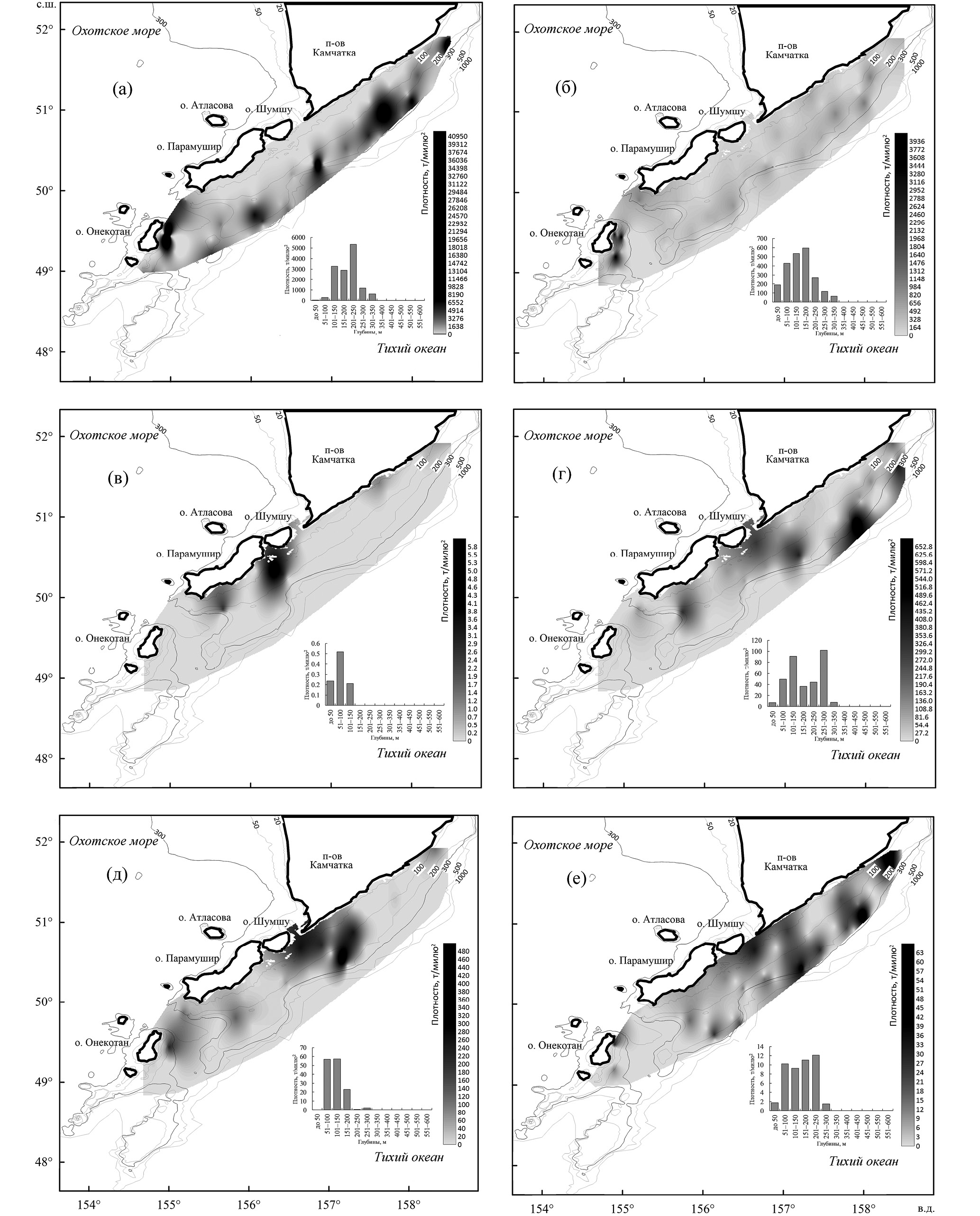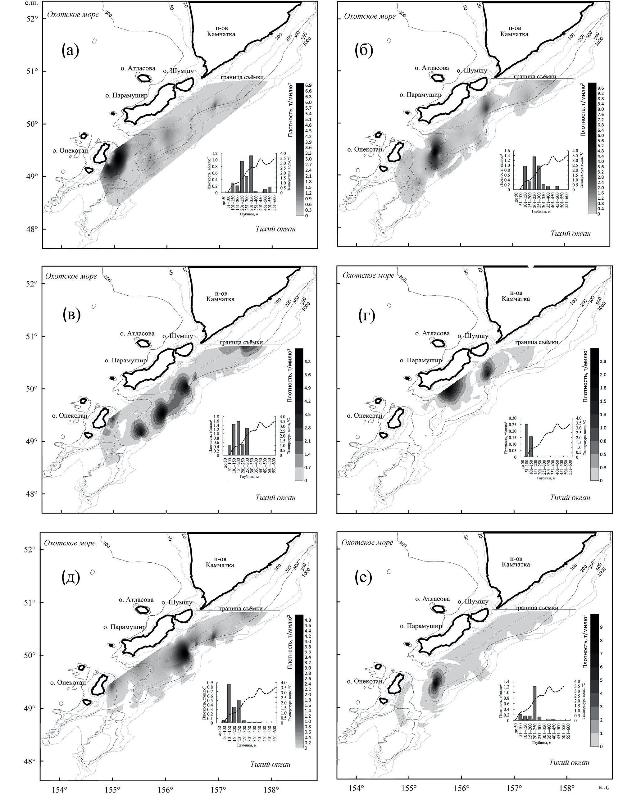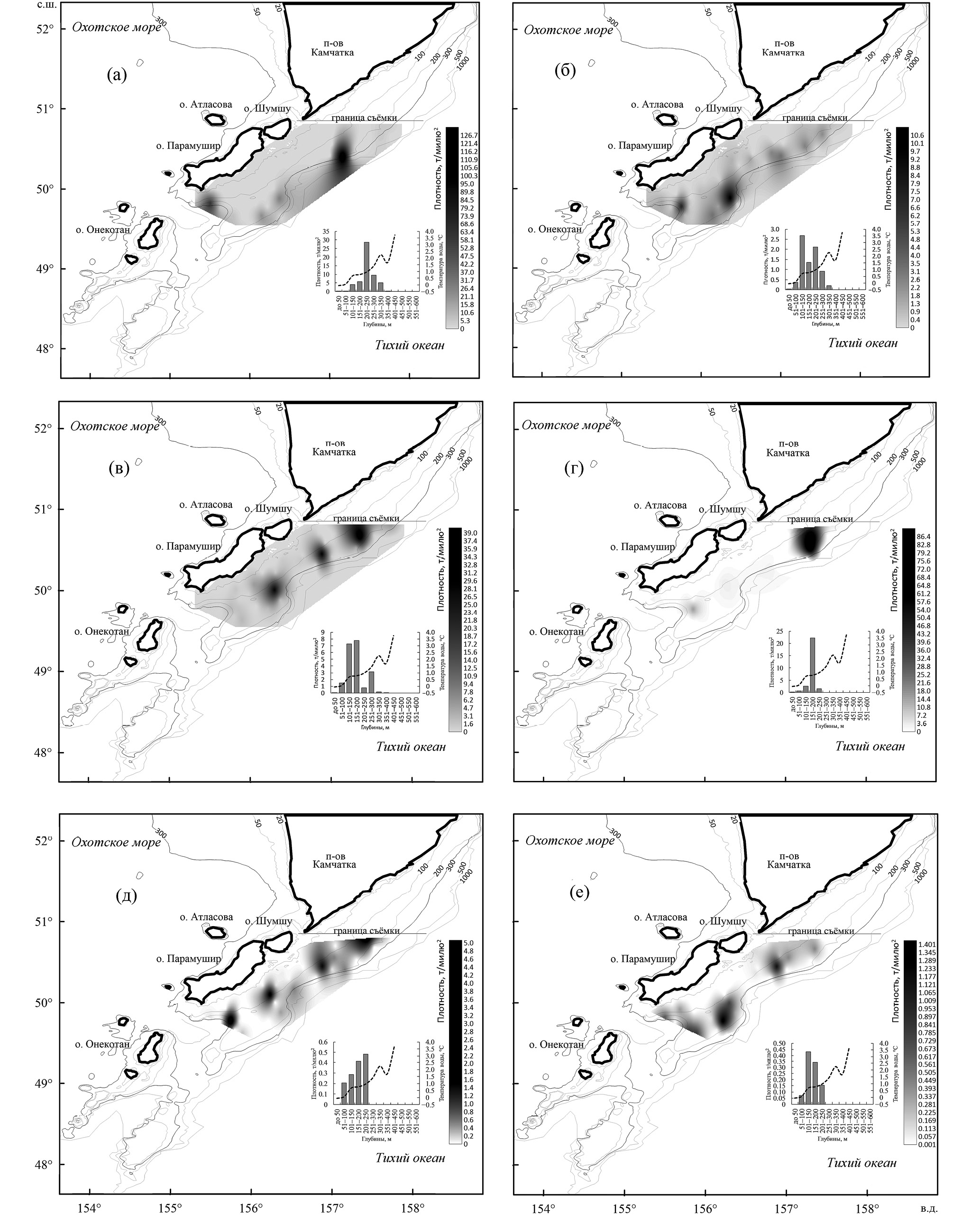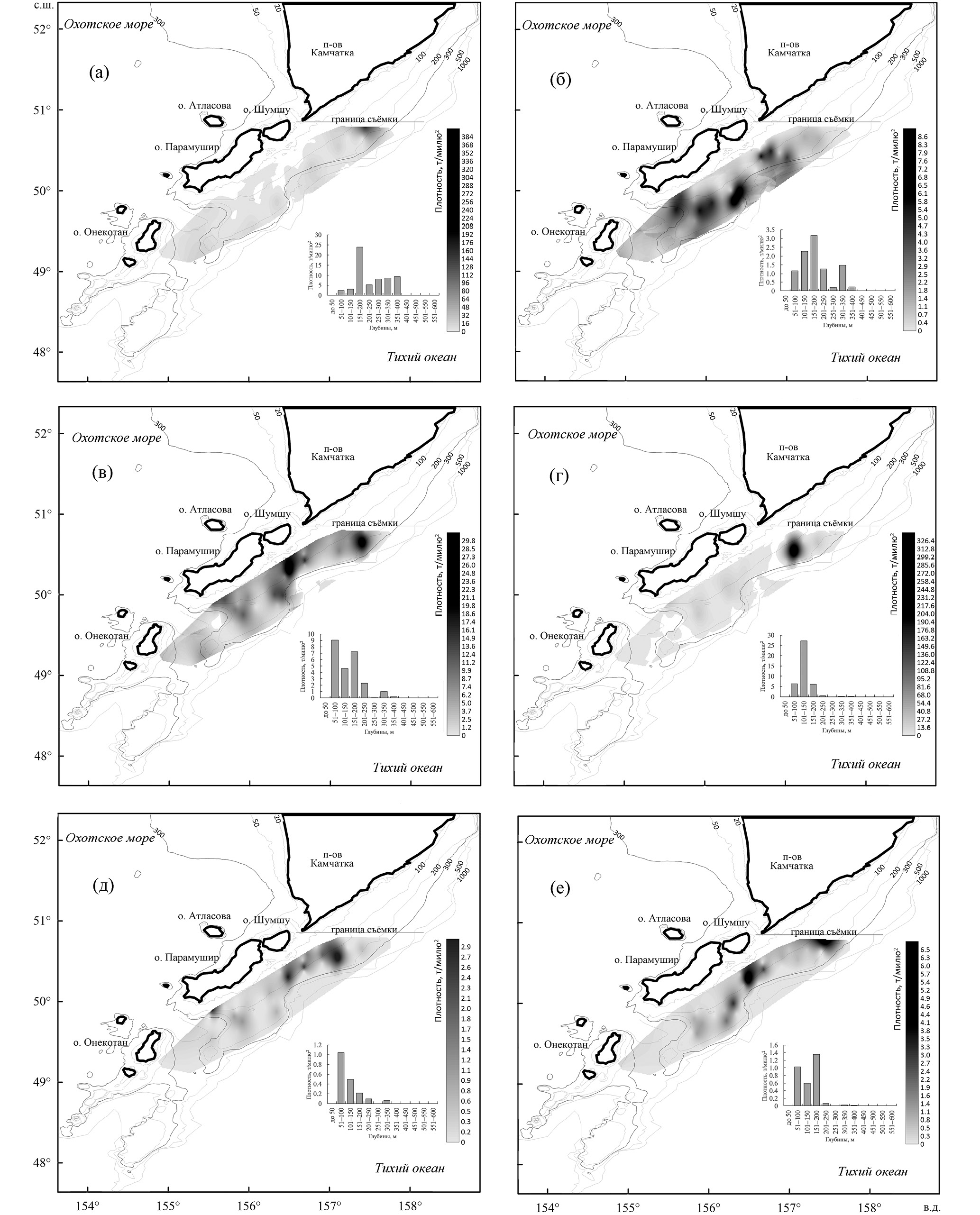 Минтай был распределён на склоне в диапазоне глубин 200–350 м (рис. 5а). Скопления вида с повышенной плотностью формировались на двух участках – на траверзе юго-восточной оконечности Камчатки, представляя край северного скопления, и на склоне выступающего плато южнее о-ва Парамушир. Треска образовывала основное скопление вдоль склона у о-вов Шумшу и Парамушир на глубинах 100–300 м (рис. 5б). Многочисленная двухлинейная камбала концентрировалась на южном плато непосредственно напротив о-ва Парамушир на глубине 100–250 м (рис. 5в). Оконтуренная часть скопления камбал на северной границе съёмки указывала на присутствие ещё одного скопления севернее 51° с. ш. у Юго-Восточной Камчатки. Белобрюхий получешуйник формировал несколько отдельных скоплений, распределённых вдоль всего о-ва Парамушир, ещё одно скопление вида было краем оконтурено на северной границе съёмки (рис. 5г). Глубины обитания рыб ограничивались значениями 50–250 м. Многочисленный узколобый шлемоносец формировал отдельное скопление на южном плато на глубинах 150–250 м (рис. 5д). Ещё один вид – широколобый шлемоносец G. detrisus – концентрировался схожим образом, формируя ряд скоплений к северу, вплоть до границы съёмки на глубинах 50–200 (максимум 250) м (рис. 5е).