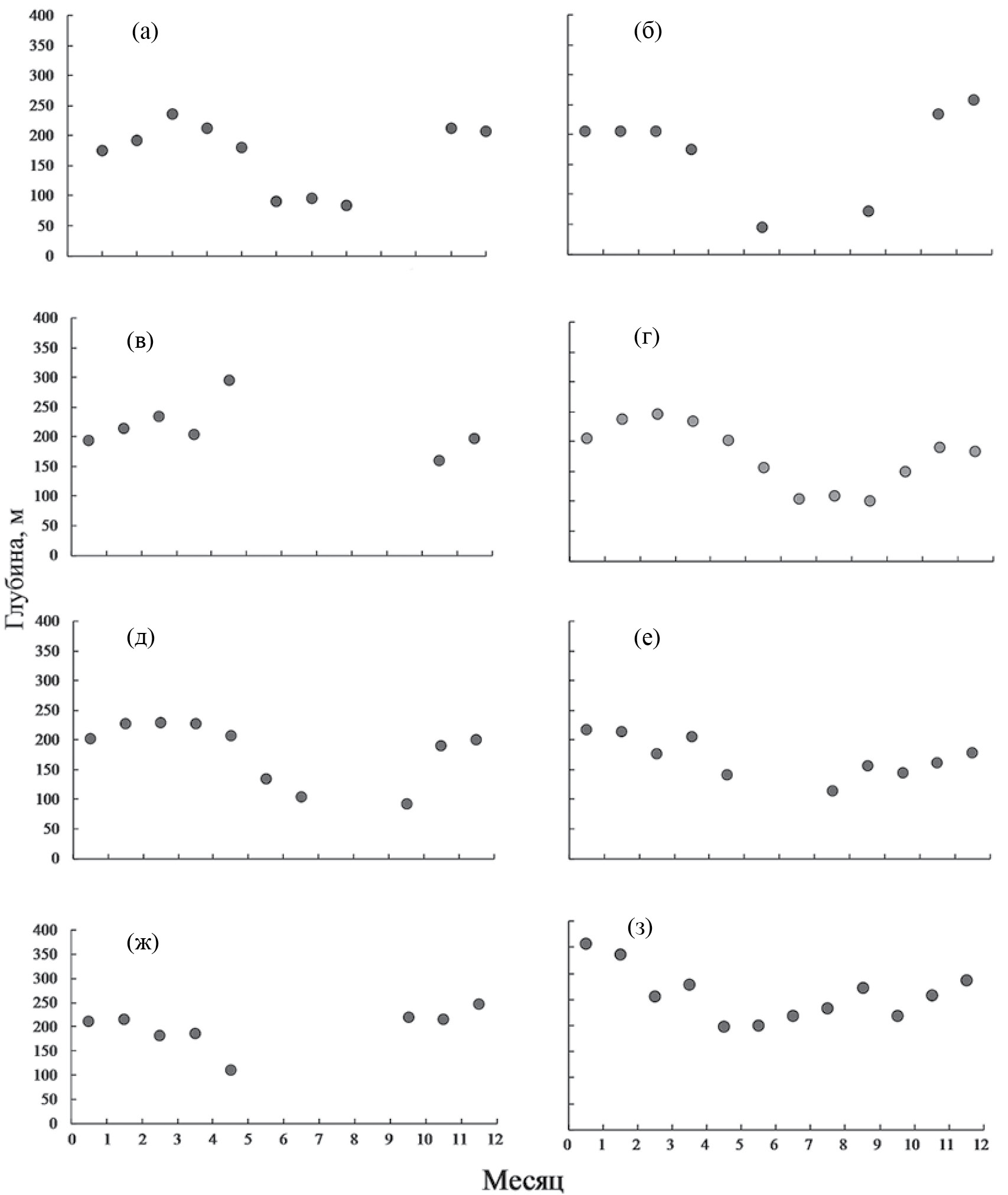 Рис. 16. Средняя глубина (●) ярусного промысла трески Gadus macrocephalus в разные месяцы в тихоокеанской подзоне Северо-Курильской зоны в 2006 (а), 2007 (б), 2009 (в), 2011 (г), 2013 (д), 2015 (е), 2021 (ж) гг. и тралового разноглубинного промысла минтая G. chalcogrammus в 2011 г. (з).