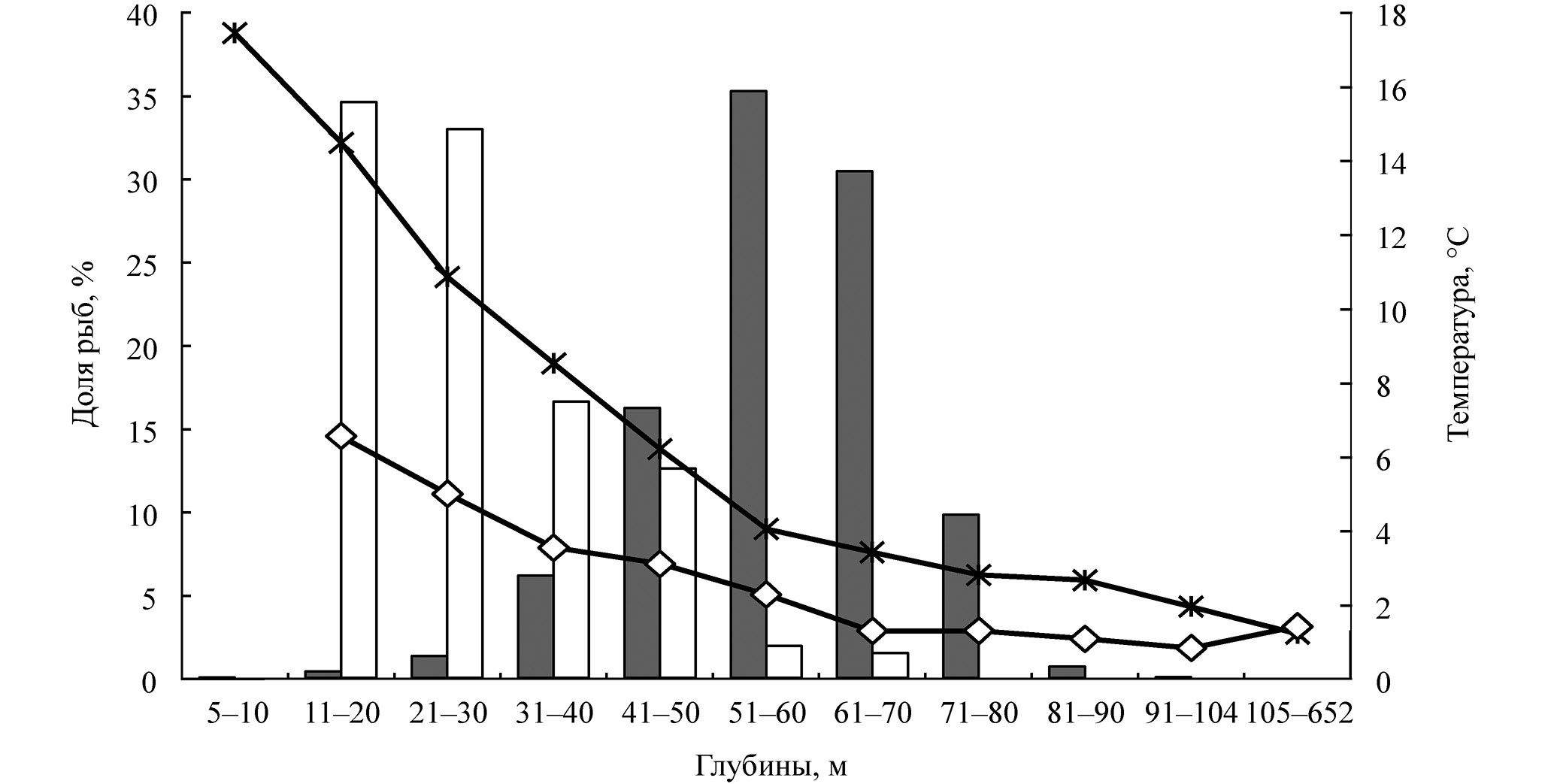В период исследований у западного побережья Камчатки нитчатый шлемоносец встречался от минимальных глубин исследований (14 м) до 64 м. В объёме данных по зал. Петра Великого, где исследовали и меньшие глубины, минимальная глубина обнаружения его располагалась в диапазоне 5–10 м, максимальная составила 104 м. У Камчатки основные скопления вида формировались на глубинах до 30 м и в меньшей степени – на 31–40 м. В заливе он концентрировался в диапазонах 51–70 и 41–50 м. На указанных глубинах двух районов вода была прогрета до сходных значений температуры (рис. 3). Соответственно и температуры, при которых концентрировался нитчатый шлемоносец, оказались сходными. Основная масса рыб в двух районах предпочитала температурный диапазон 2.1–6.5°C. В целом же температура придонного слоя воды у Западной Камчатки варьировала в пределах от –0.2 до 12.1°C, в зал. Петра Великого – от 0.4 до 22.6°C. В первом районе нитчатый шлемоносец встречался при температуре от 0.5 до 12.1°C, во втором – от 1.0 до 18.5°C.