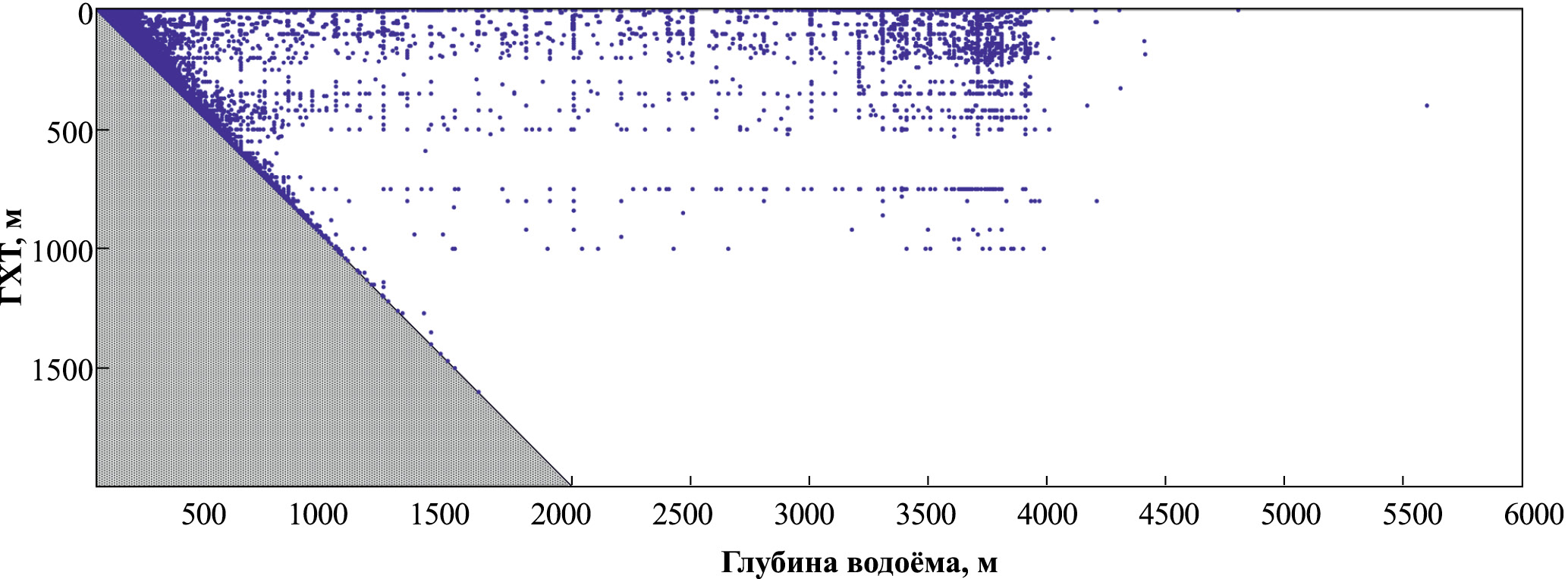 Рис. 1. Распределение траловых станций научных и промысловых экспедиций ТИНРО в Беринговом море в 1963–2020 гг. по глубинам водоёма в зависимости от горизонта хода трала (ГХТ): (·) – траления. Здесь и на рис. 3, 4: (▒▒▒) – схематичное изображение материкового склона.