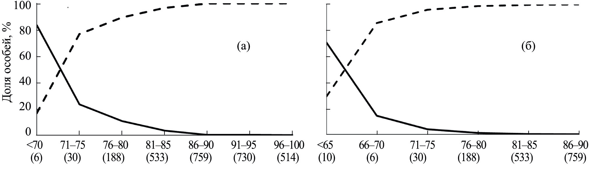 Рис. 5. Динамика полового созревания самок (а) и самцов (б) малоглазого макруруса Coryphaenoides pectoralis Берингова моря: (―) – неполовозрелые особи, (- – -) –половозрелые.