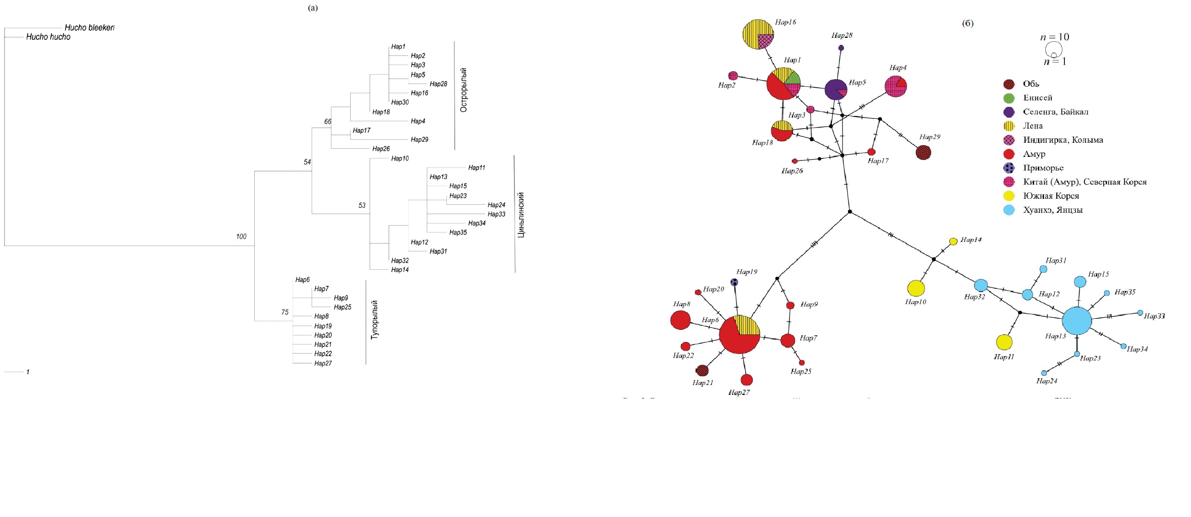 На MP-дереве для фрагмента контрольного района мтДНК длиною 411 п.н. (рис. 3а) выделяются три клады гаплотипов с умеренной бутстреп-поддержкой (66, 53 и 75%). Клады острорылого и циньлинского ленков из Китая являются сестринскими, хотя и с низкой поддержкой (54%). Гаплотипы, которые соответствуют каждой из трёх форм ленка, образуют три клады в MJ-сети (рис. 3б). Гаплотип Hap4 (последовательности DQ017068–DQ017071) выявлен у ленка верховья р. Тумень (в России – р. Туманная), которая протекает по территории Китая и Северной Кореи и впадает в Японское море, а также в одном из притоков Амура на территории Китая (MH885388, FJ713576). Гаплотип Hap30 (DQ017066), который выявлен у ленка р. Ялу (впадает в Жёлтое море), отличается от широко распространённого гаплотипа Hap1 только вставкой одного нуклеотида (A). Так как программа PopART игнорирует сайты с инделами, в MJ-сети Hap30 неотличим от Hap1. Оба гаплотипа (Нар4 и Hap30) расположены в кладе острорылого ленка. Число гаплотипов по фрагменту контрольного района мтДНК длиною 494 п.н. (Froufe et al., 2008), которые были выявлены в выборках, проанализированных по аллозимам (Осинов, 1990; настоящая работа), выше, чем по фрагменту, состоящему из 411 п.н. На рис. 2 отмечены гаплотипы мтДНК, выявленные в этих выборках по фрагменту длиною 411 п.н. и отражённые на рис. 3.