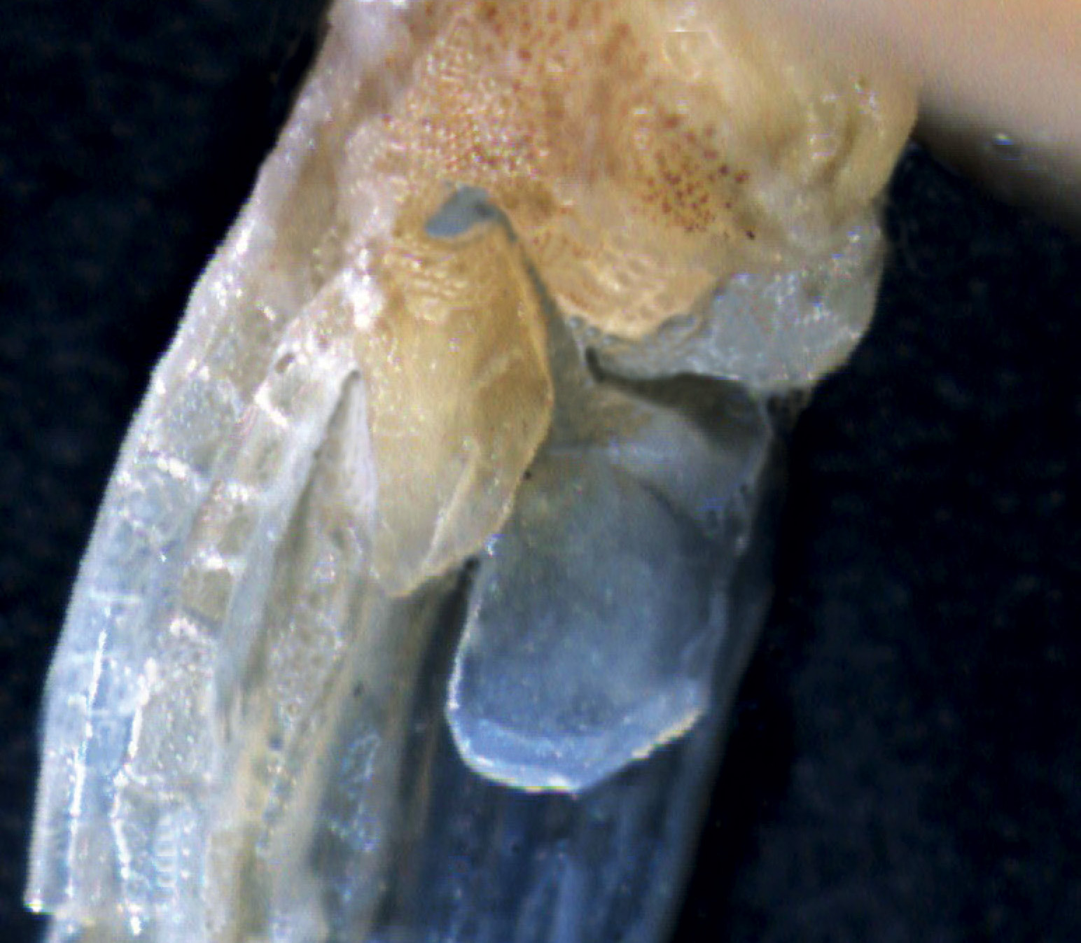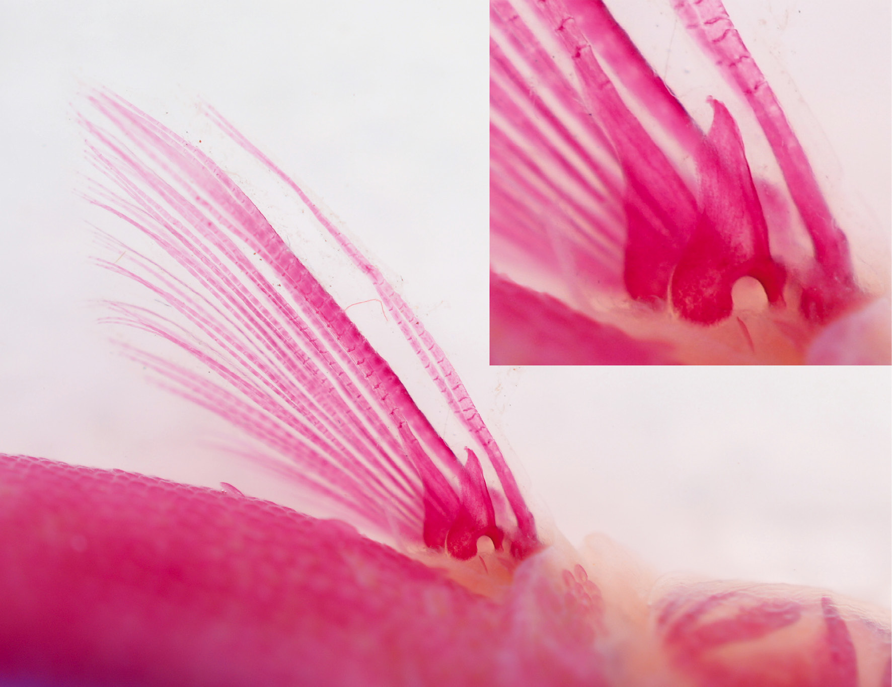 Рис. 2. Левый грудной плавник самца Misgurnus chipisaniensis SL 90.5 мм, FSCEATB MBS-054/4 из коллекции ФНЦ биоразнообразия ДВО РАН с двумя органами Канестрини на неветвистом и первом ветвистом лучах.