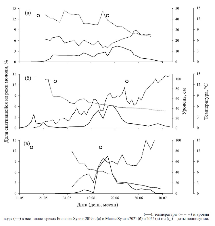Молодь скатывалась с наибольшей интенсивностью с 00:00 до 03:00, в течение этого промежутка времени в первой половине миграции (фаза роста) мигрировало в среднем 79.6%, а во второй (фаза спада) – 82.0% покатников (табл. 2). В 2019 и 2021 гг. интенсивность ската снижалась при полнолунии. В 2022 г. после кратковременного снижения перед наступлением полнолуния она стала нарастать, и это совпало с появлением плотной облачности (100%). Формально скат наиболее продолжительным был в 2021 г. (61 ночь) вследствие рассчитанного большого количества молоди, скатившейся в середине мая (рис. 2). Однако эти результаты получены на основе уловов единичных мальков при выставлении ловушки вследствие паводка не в стандартной позиции. Отсутствие уловов или единичные поимки мальков в последующие ночи были основанием для отказа от проведения серии ловов для корректного суждения о плотности миграционного потока в разных позициях поперечного створа. Такую серию провели только в ночь на 13 июня при спавшем уровне воды и с поимкой мальков на всех позициях створа, в том числе с наибольшими уловами в стрежневой части потока. Исходя из этих данных, позиции лова до 26 мая находились за пределами основного миграционного потока молоди, что чревато появлением крупных ошибок при расчётах численности покатников (Каев, 2009). Поэтому данные, полученные до 26 мая, не использованы при аналитических расчётах. С учётом такого нюанса продолжительность покатной миграции за три года составила в среднем 42 (33–47) ночи, в то же время 90% покатников мигрировали в среднем за 29 (21–36) ночей.