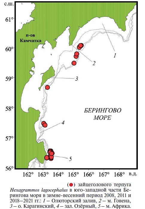 Зайцеголовый терпуг был обычным видом прилова при промысле северного однопёрого терпуга Pleurogrammus monopterygius, трески Gadus macrocephalus и камбал (Pleuronectidae). Частота встречаемости по годам варьировала в пределах 14.3–32.0%. Основные места поимок исследуемого вида локализованы на участках с резким перепадом глубин напротив выступающих мысов Африка и Говена – соответственно 40 и 7 случаев из 53. На значительной площади Олюторского залива зайцеголовый терпуг отсутствовал. Кроме того, он отмечен юго-восточнее о-ва Карагинский и в северной части зал. Озёрный (рис. 2).