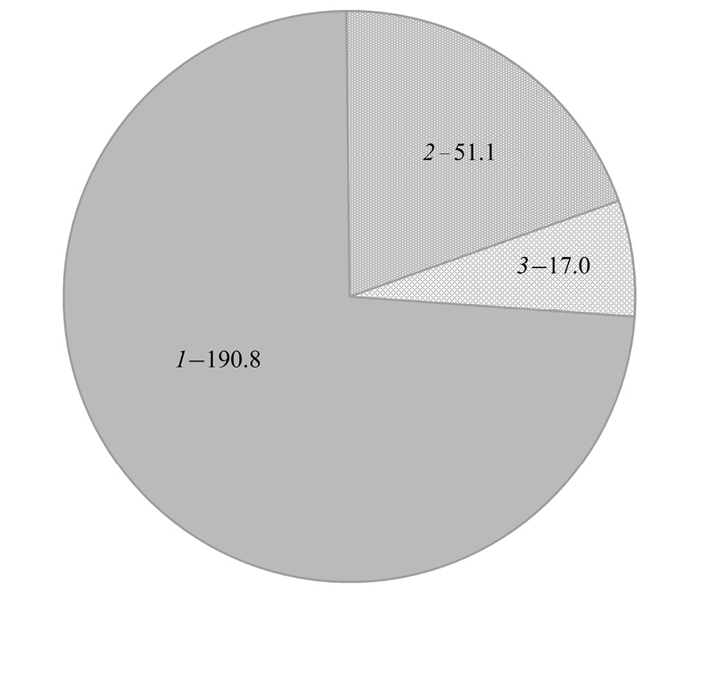 Рис. 6. Среднегодовое потребление (млн т) минтаем Gadus chalcogrammus гидробионтов (доминирующие группы) в эпипелагиали Берингова моря в 2011–2020 гг.: 1 – планктон (73.7%): Copepoda (41.4%), Euphausiacea (20.7%), прочие (11.6%); 2 – нектон (19.7%): Pisces (17.5%), Decapodiformes (2.2%); 3 – бентос (6.6%): Decapoda (5.1%), прочие (1.5%).