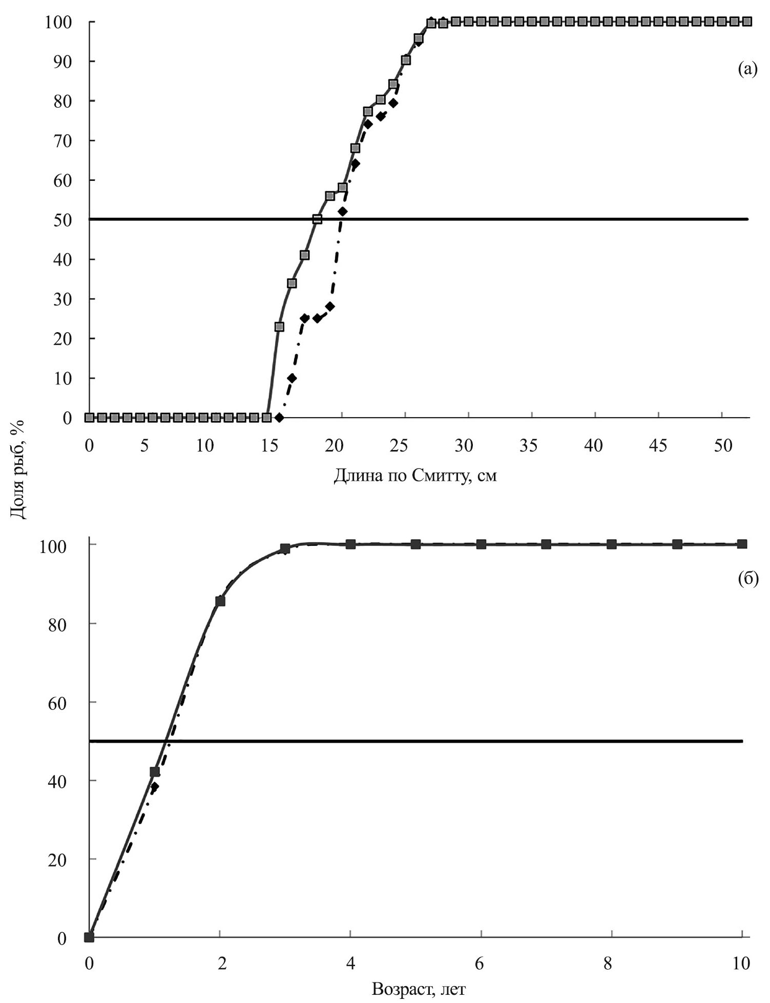 Рис. 1. Огивы созревания африканской скумбрии Scomber colias различных длины (а) и возраста (б) в ЦентральноВосточной Атлантике с февраля по ноябрь 2004–2017 гг.: (−·♦−·) – самцы, (−■−) – самки, (—) – 50%-ная доля половозрелых особей.