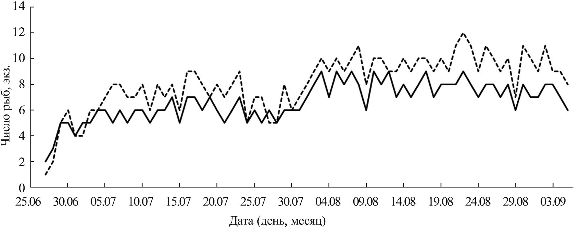 Всего за период работ поймано 1048 сазанов, средний суточный улов составил 7.23 ± 2.13 экз. Рыбы были пойманы донками обоего типа, общая динамика поимок, несмотря на вариабельность суточных уловов, была сходной (коэффициент корреляции Пирсона r = 0.90, p < 0.01) (рис. 6). Однако уловистость донок с бойлами была выше, чем макушанками – 575 против 473 экз., в среднем соответственно по 8.09 ± 2.02 и 6.67 ± 1.87 экз/сут (p < 0.01). В августе, когда было поймано 543 экз. (51.8% всех сазанов), средний суточный улов составлял 8.72 экз/сут, при этом 9.68 и 7.84 экз/сут соответственно для донок с бойлами и для макушанок (p < 0.01).