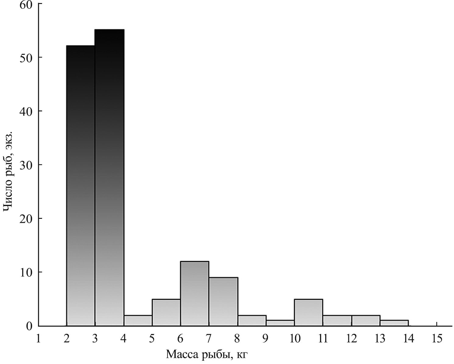 Рис. 7. Распределение по массе особей сазана Cyprinus carpio в объединённой выборке из уловов 2018 г.