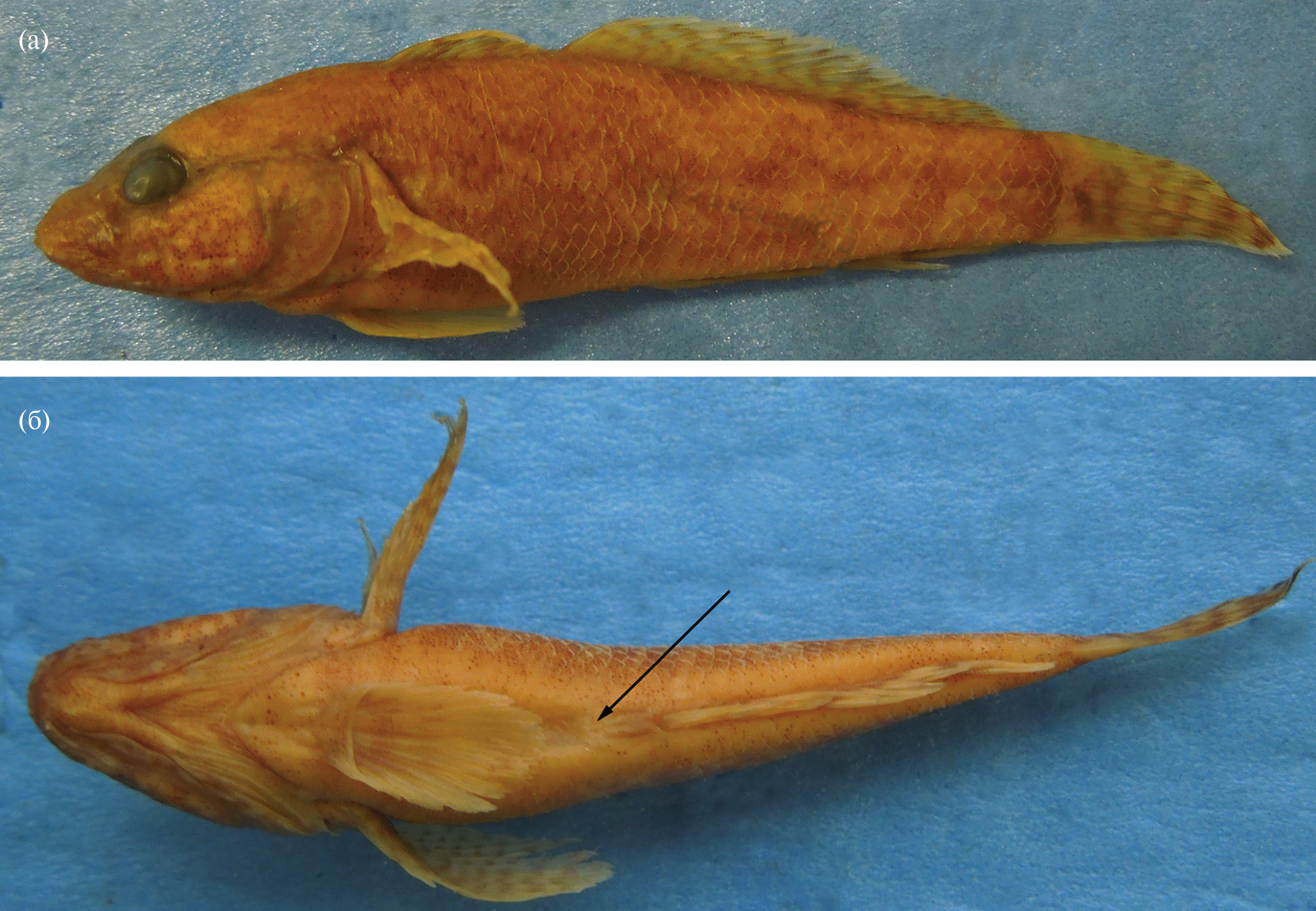 Рис. 1. Proterorhinus victori sp. novа, голотип, ЗММУ Р-24619, р. Кинтриши, самка SL 46.7 мм, вид: а – сбоку, б – снизу; здесь и на рис. 2: (→) – анальное отверстие.