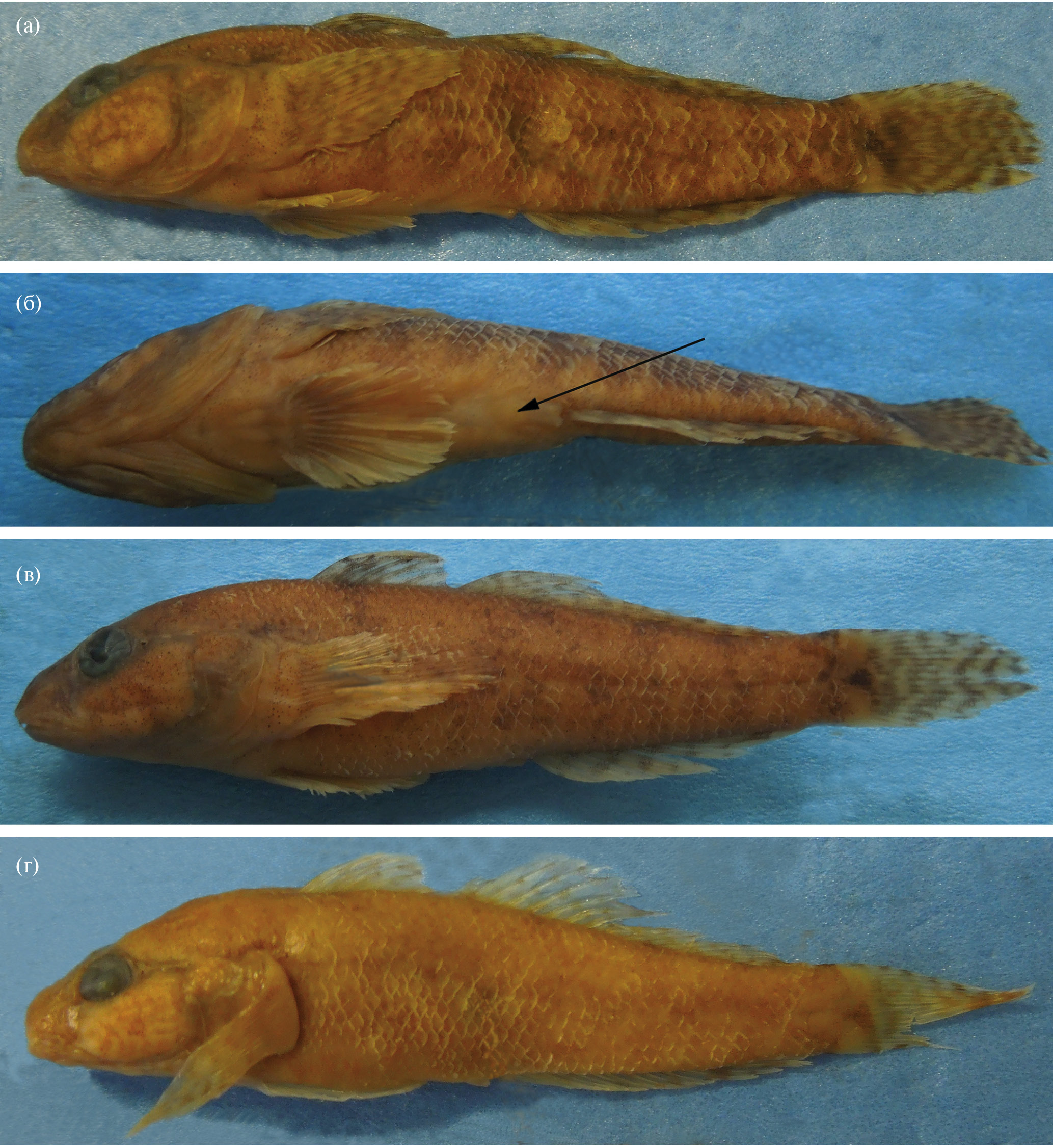 Рис. 2. Proterorhinus victori sp. novа, паратипы: а–в – ЗММУ Р-17487, оз. Кахабери: а, б – самка SL 47.5 мм, вид соответственно сбоку и снизу; в – самка SL 45.0 мм; г – Р-24620, р. Кинтриши, самка SL 40.0 мм.