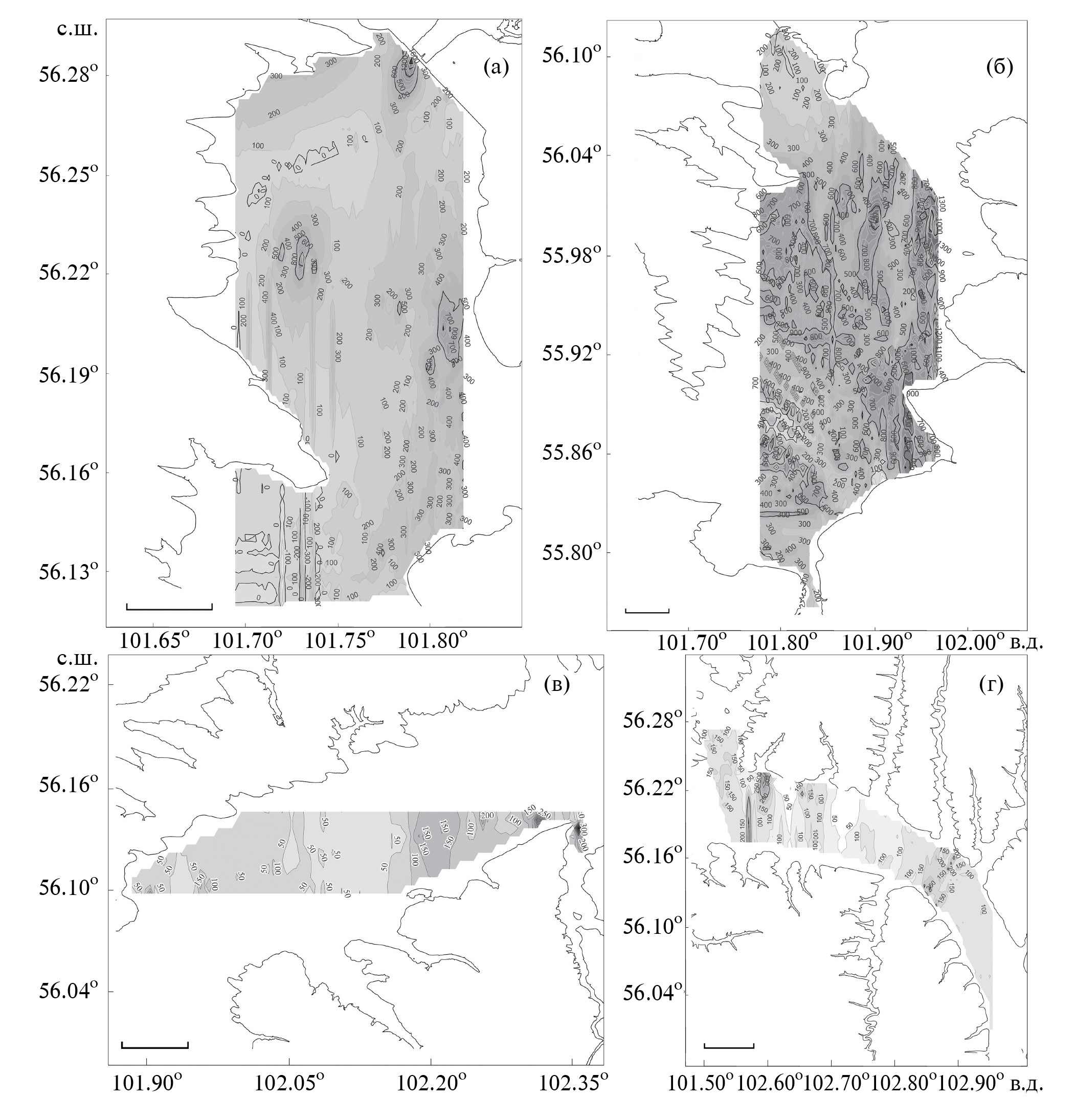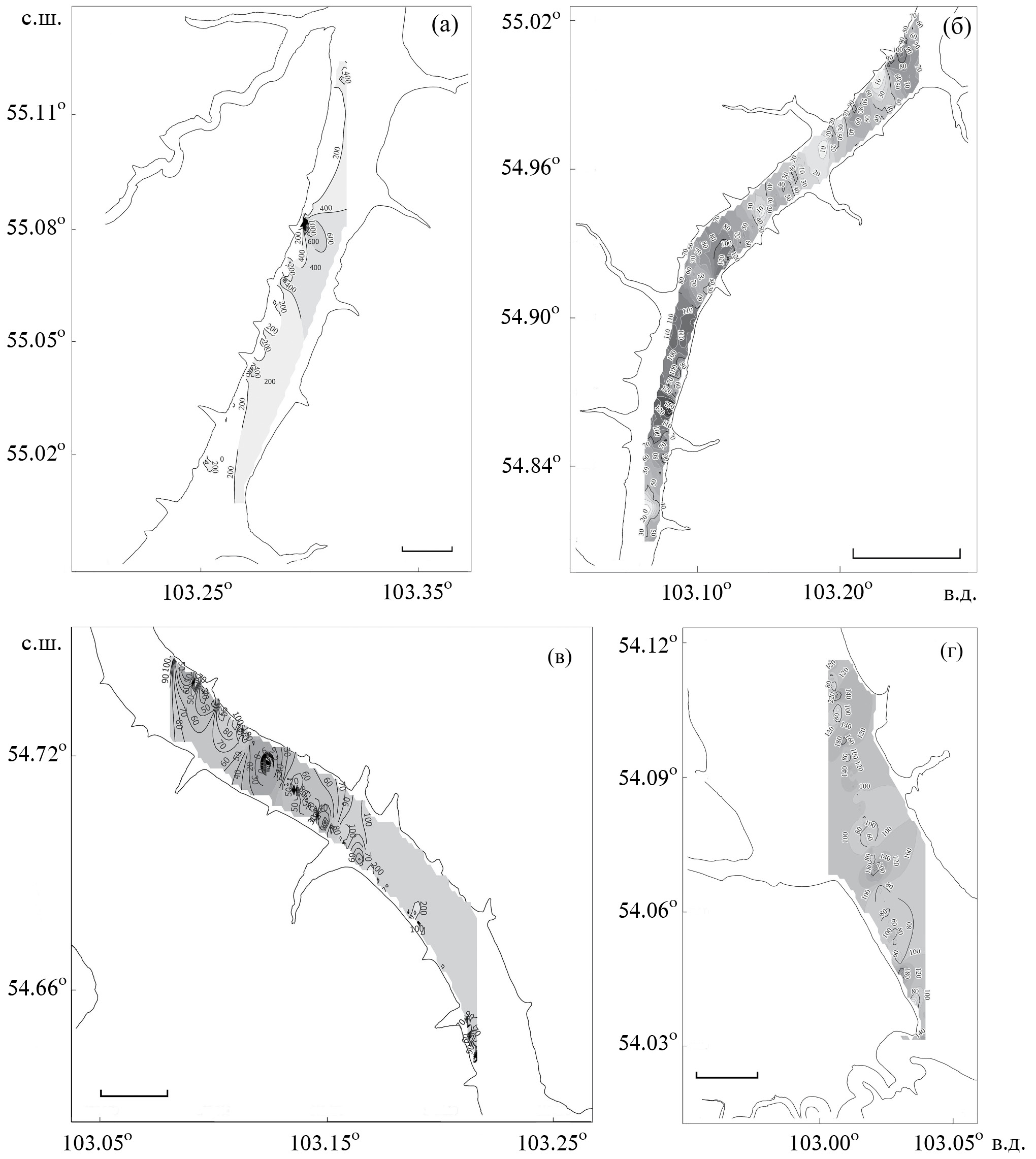 Рис. 2. Пространственное распределение рыб в Братском водохранилище на участках озёрного типа: а – приплотинный плёс; б – Долоновское расширение; в, г – широтный Наратайско-Заярский плёс. Масштаб, км: а, б – 3; в, г – 5. Здесь и на рис. 4: числа на изолиниях обозначают плотности зарегистрированных скоплений, экз/га.