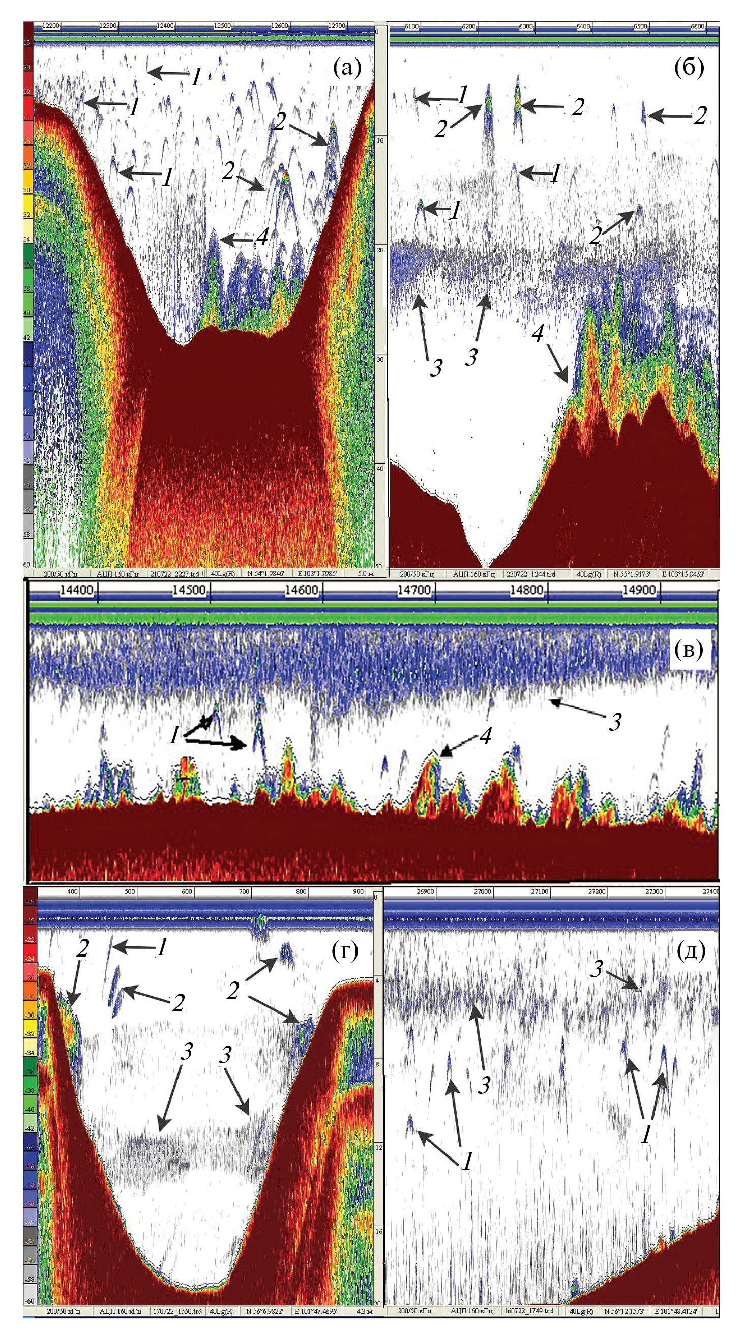 Рис. 3. Характерные эхограммы регистрации рыб и рыбных скоплений в акватории Братского водохранилища на участках озёрного (а–в) и речного (г, д) типов в светлое (а, г) и тёмное (б, в, д) время суток: 1 – одиночные рыбы, 2 – скопления и стаи рыб, 3 – мигрирующий планктон, 4 – затопленный лес.
