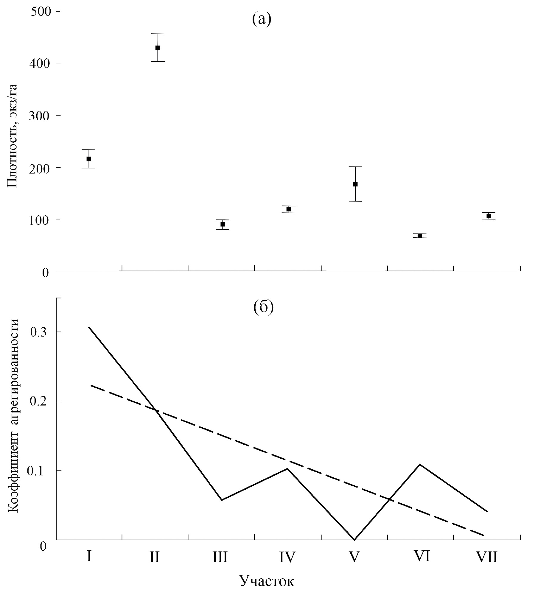Рис. 5. Плотность рыб (а) и коэффициент агрегированности (б) в рыбных скоплениях на обследованных участках акватории Братского водохранилища: (- -) – линия тренда. Здесь и на рис. 6: (⌶) – доверительный интервал; нумерацию и расположение участков см. на рис. 1.