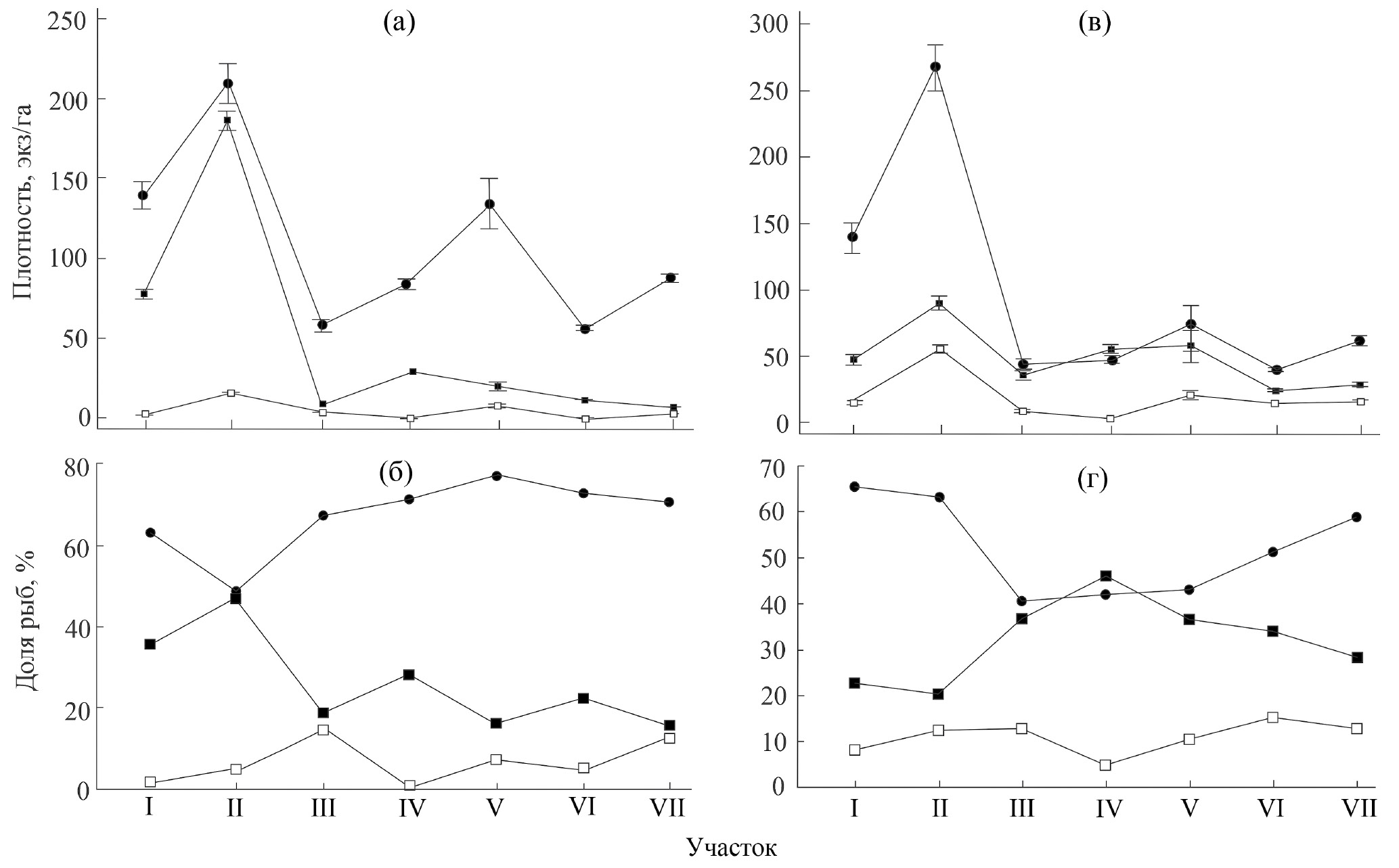 Рис. 6. Динамика плотности и относительной численности рыб различных размерных групп (а, б) и семейств (в, г) на обследованных участках акватории Братского водохранилища. Размерные группы, мм: (●) – 30–100, (■) – <30, (□) – >100. Семейства: (●) – окунёвые, (■) – карповые, (□) – сиговые.