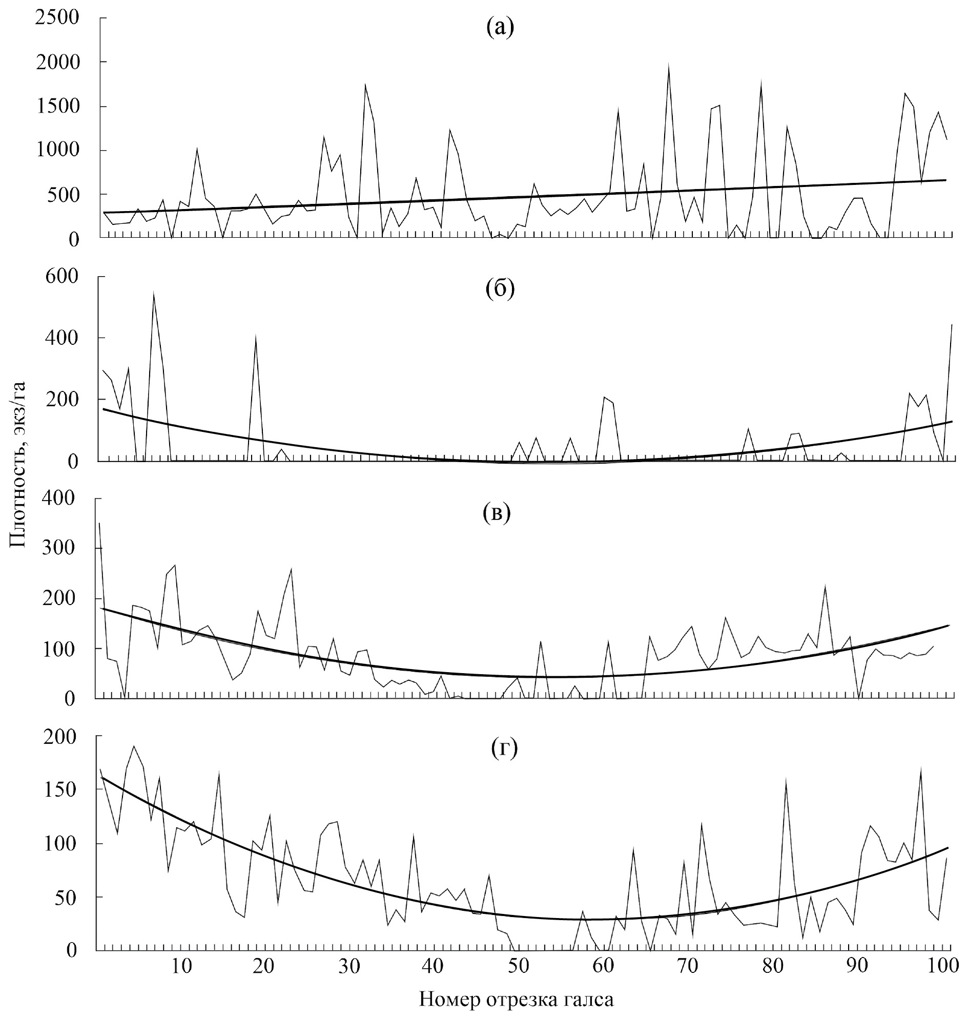 Рис. 7. Поперечное распределение рассчитанной за каждые 100 посылок гидроакустического сигнала средней плотности рыб (–) на обследованных участках Братского водохранилища при разной скорости стокового течения. Участки (нумерацию и расположение см. на рис. 1): а – II при отсутствии стокового течения, б – I (скорость течения 0.02 м/с), в – III (0.04 м/с), г – VI (0.06 м/с), ( – ) – линия тренда.