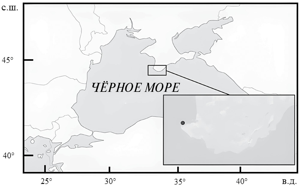 Экземпляр барракуды был пойман 28.10.2022 г. в прибрежной акватории Чёрного моря у г. Севастополь на выходе из бух. Стрелецкая (44°56ʹ с.ш., 34°06ʹ в.д.) ставным неводом, установленным на глубине 12 м (рис. 1). Температуру воды оценивали по показаниям эхолота Lowrance HOOK2 4X Bullet Scimmer (“Navico Inc.”, США) с точностью до 1°С. После поимки особь заморозили, затем передали авторам настоящей публикации для исследований. Идентификацию видовой принадлежности осуществляли по каталогам-определителям (Световидов, 1964; Васильева, 2007; Carpenter, De Angelis, 2016). Длину тела – общую (TL), стандартную (SL) и по Смиту (FL), измерили с точностью до 0.1 cм, массу тела (общую и без внутренностей) – до 0.01 г, массу гонад и печени – до 0.001 г. Гонадосоматический индекс вычислили отношением массы гонад к массе тела без внутренностей и выразили в процентах.