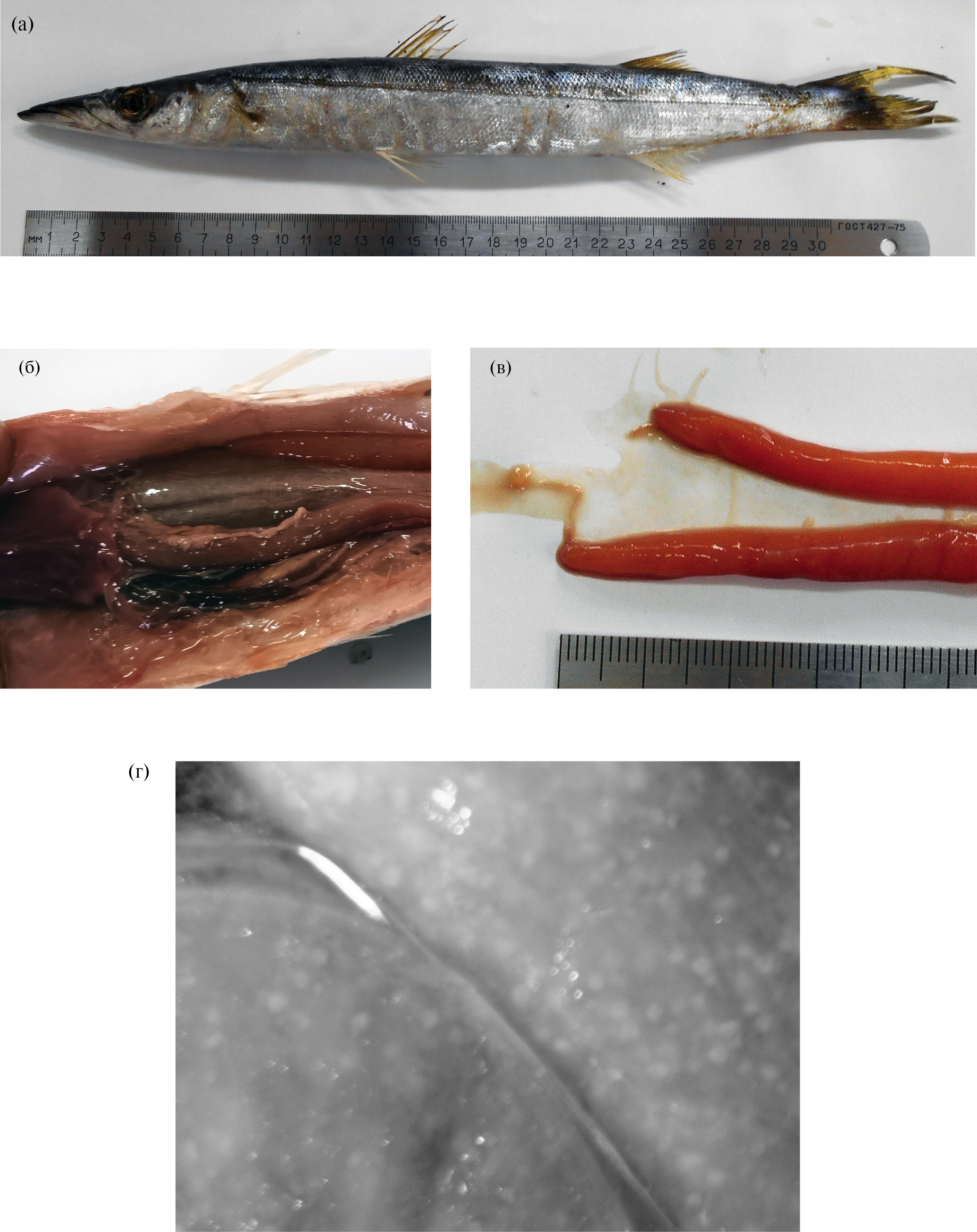 Рис. 2. Sphyraena sphyraena TL 35.4 см, пойманная 28.10.2022 г. у берегов Крыма (г. Севастополь): а – внешний вид, б – вскрытая брюшная полость, в – гонады, г – резорбирующие ооциты.