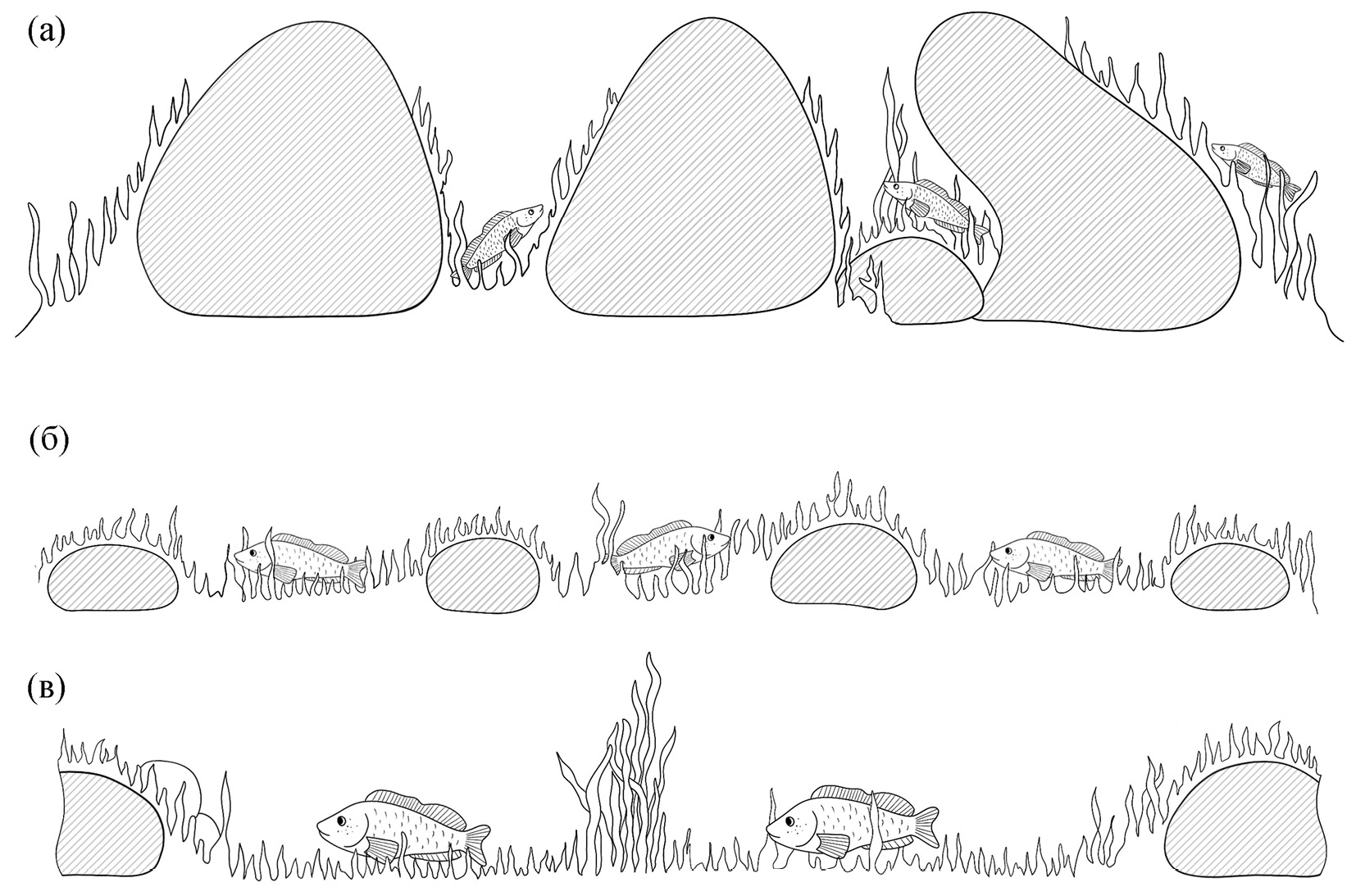 Характеристики нерестовых участков. В преднерестовый период происходит активная борьба самцов за пространство, характеризующаяся высокими тратами энергии рыб и стрессом. Сложная, неоднородная среда естественным образом ограничивает поле зрения рыбы и способствует снижению стресса, улучшению защиты и, как следствие, увеличивает репродуктивный успех нерестящихся рыб (Myhre et al., 2013; Zhang et al., 2021). В нашем исследовании обнаружено, что неоднородная среда обеспечивает широкий спектр условий для самцов различных размерных групп. Большое количество валунов небольшого размера (покрытых макрофитами и эпифитами) образует значительное количество нерестовых участков – ямок, углублений и так далее (рис. 1).