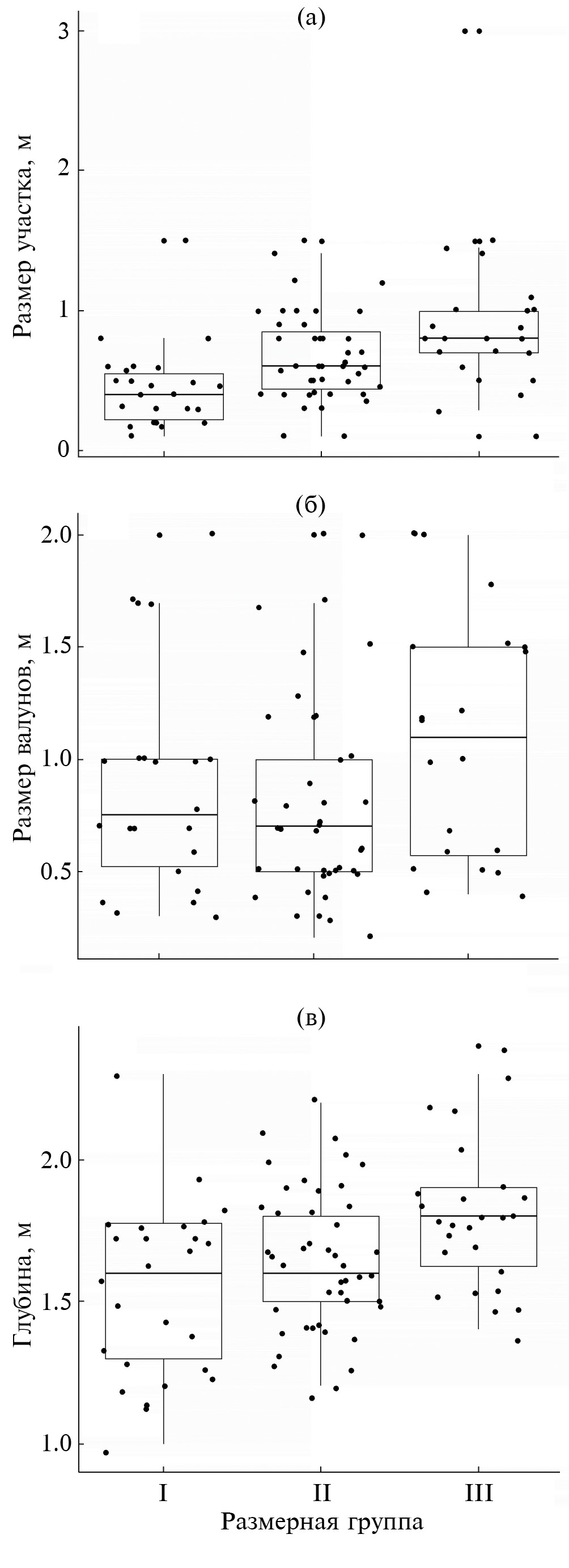 Рис. 2. Распределение трёх размерных групп самцов бурого терпуга Hexagrammos octogrammus (●) в зависимости от: а – размера охраняемого нерестового участка, б – среднего размера валунов на нём, в – глубины его расположения. ( | ) – минимальное и максимальное значения; каждый бокс включает три горизонтальные линии, которые обозначают 25, 50 (медиана) и 75% данных.