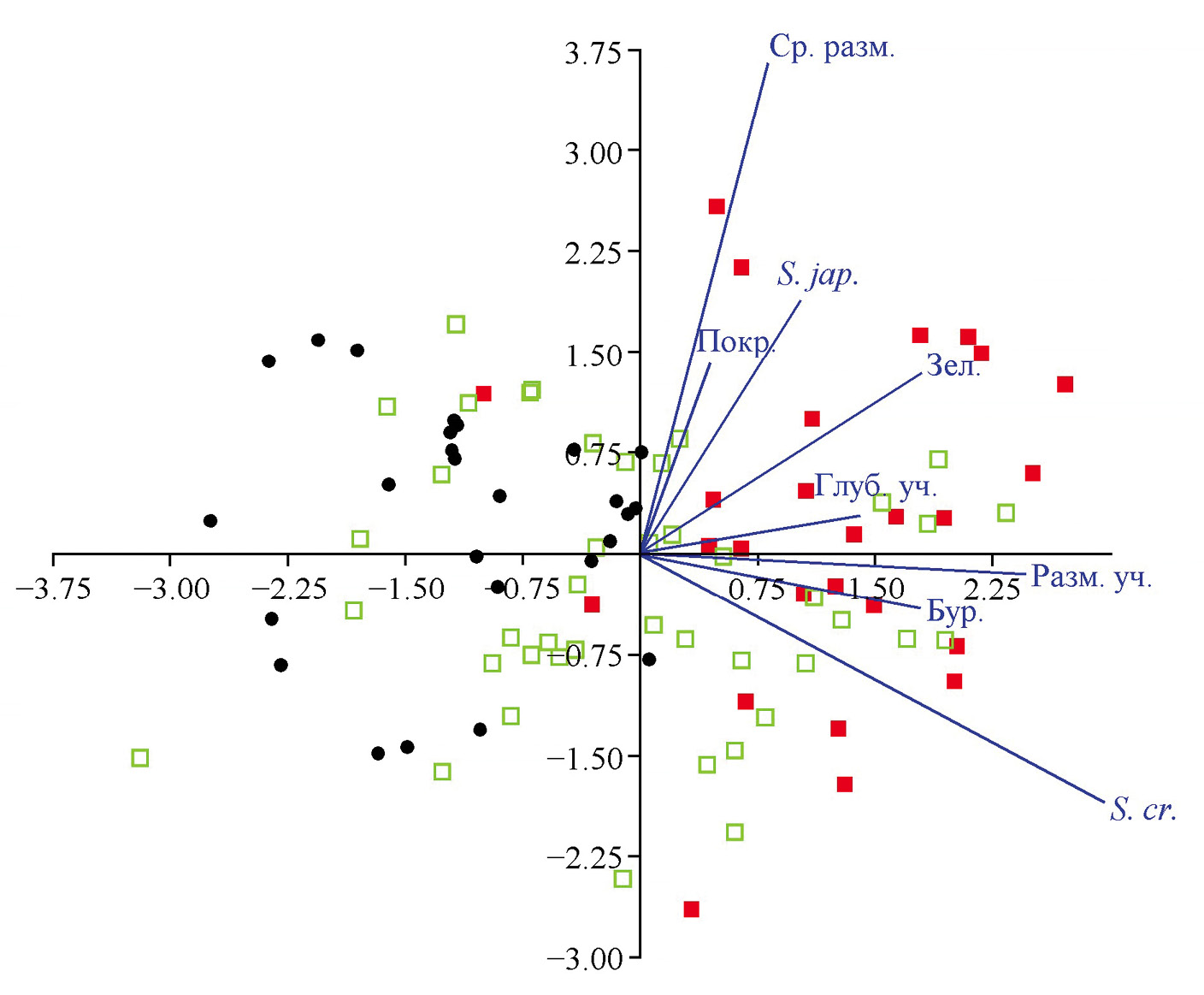 Рис. 3. Результат дискриминантного анализа всей матрицы некоррелируемых факторов: наличия на нерестовом участке бурых (Бур.) и зелёных (Зел.) водорослей, Saccharina japonica (S. jap.), Stephanocystis crassipes (S. cr.). Ср. разм. – средний размер валунов; Разм. уч., Глуб. уч. – размер нерестового участка и глубина его расположения, Покр. – проективное покрытие участка водорослями. Группы самцов: I (•), II (□), III (■) – соответственно малоразмерные (общая длина тела 11–15 см), среднеразмерные (16–19 см) и крупные (20–23 см).