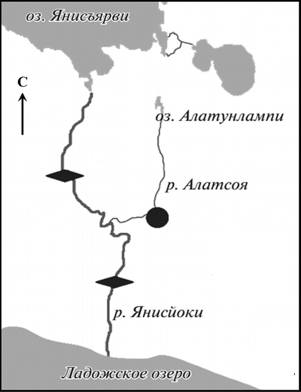 Рис. 1. Карта-схема расположения р. Алатсоя в бассейне Ладожского озера: (●) – район работ, (♦) – плотины (по: Павлов и др., 2020).