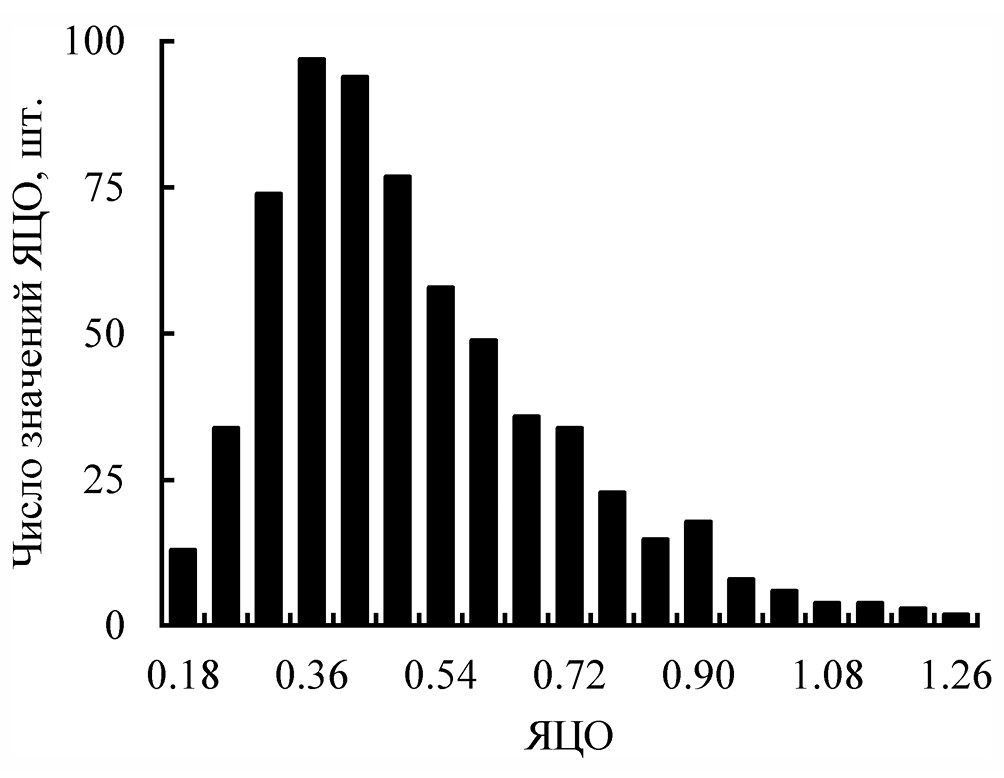 Рис. 4. Частотное распределение значений (середины классов) ядерно-цитоплазматического отношения (ЯЦО) у 22 самок в возрасте 0+.