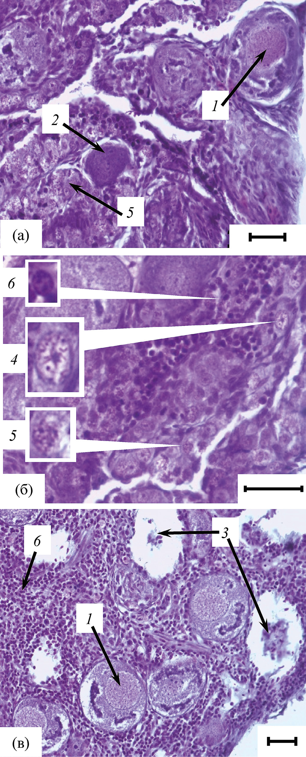 Рис. 5. Фрагменты гонад кумжи Salmo trutta в возрасте 0+ с мужскими и женскими половыми клетками: а, б – FL 49 мм, масса 1.2 г; в – 53 мм, 1.7 г. 1 – ооциты, 2 – ооцит в состоянии деструкции, 3 – фрагменты разрушившихся ооцитов, 4 – сперматогонии; 5, 6 – сперматоциты соответственно 1-го и 2-го порядков.