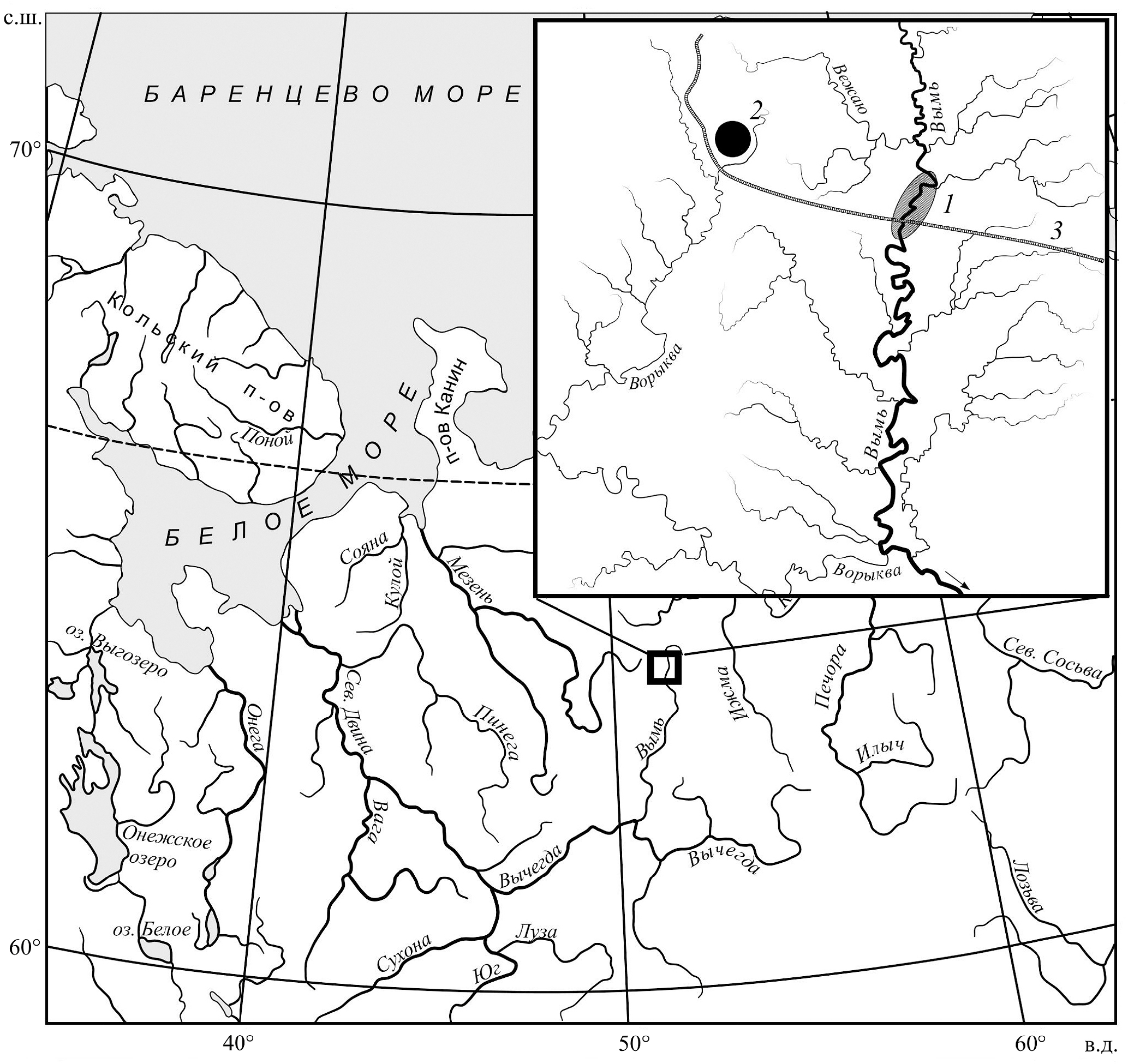 Рис. 1. Карта-схема расположения района работ: 1 — место сбора материала, 2 — Средне-Тиманский бокситовый рудник, 3 — железная дорога и автодорога, (→) — направление течения.