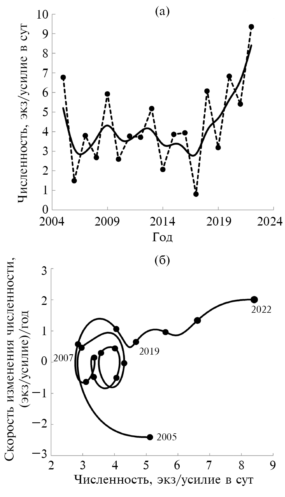 Анализ динамического фазового портрета позволил выделить три разных периода в функционировании популяции верхневымского хариуса. В 2005 г. эта группировка находилась в процессе перехода в новое состояние с меньшим уровнем численности, а скорость снижения численности в это время была наибольшей за весь период наблюдений (−2.4 (экз/усилие)/год). Далее скорость изменения этого показателя снижалась, и с 2007 г. траектория стала приобретать вид закручивающейся спирали, характерной для систем, находящихся в стационарном состоянии. В это время в популяции хариуса наблюдались лишь циклические колебания численности вокруг значения показателя ~ 3.5–3.8 экз/усилие. После 2018 г. траектория системы вновь меняется. Кривая на графике приобретает вид выпуклой дуги, свойственной системам, находящимся в процессе перехода в новое состояние с более высоким значением анализируемого параметра (рис. 2б). Действительно, к 2022 г. относительная численность хариуса (по сглаженным данным) возросла более чем в 1.6 раза по сравнению с данными 2005 г.