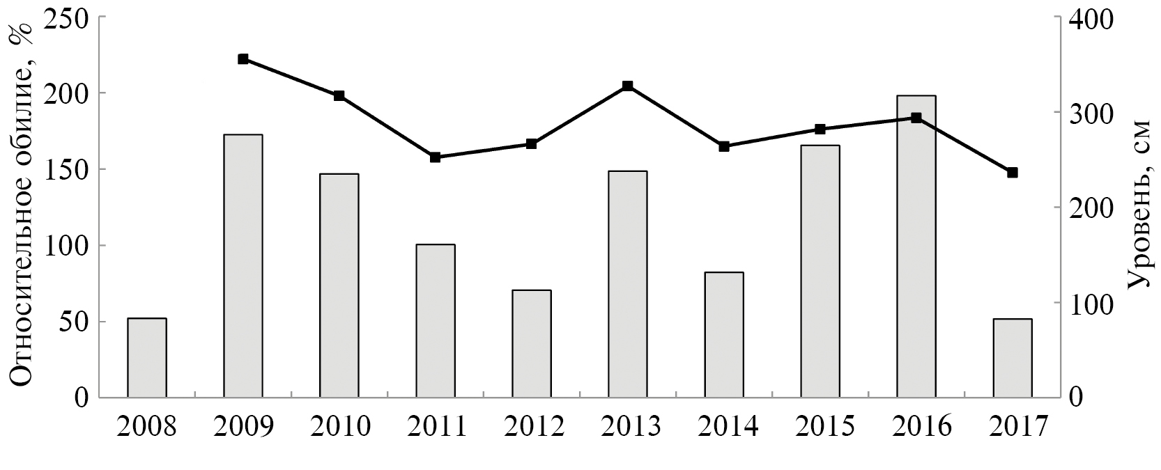Рис. 4. Относительное обилие европейского хариуса Thymallus thymallus поколений 2008–2017 гг. рождения (◻) и средний уровень воды с мая по октябрь предыдущего года (―■―) в р. Вымь. Данные по уровню воды приведены по гидропосту с. Весляна (https://allrivers.info/gauge/vym-veslyana. Version 03/2024).