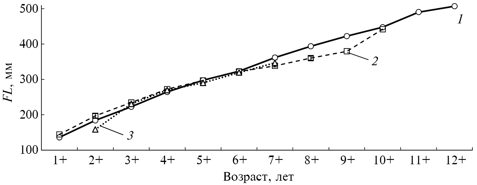 Рис. 5. Линейный рост (FL — длина тела по Смитту) европейского хариуса Thymallus thymallus р. Вымь поколений, сформировавшихся в годы разных этапов функционирования популяции: 1 — 1972–1993, 2 — 2008–2012, 3 — 2015–2018.