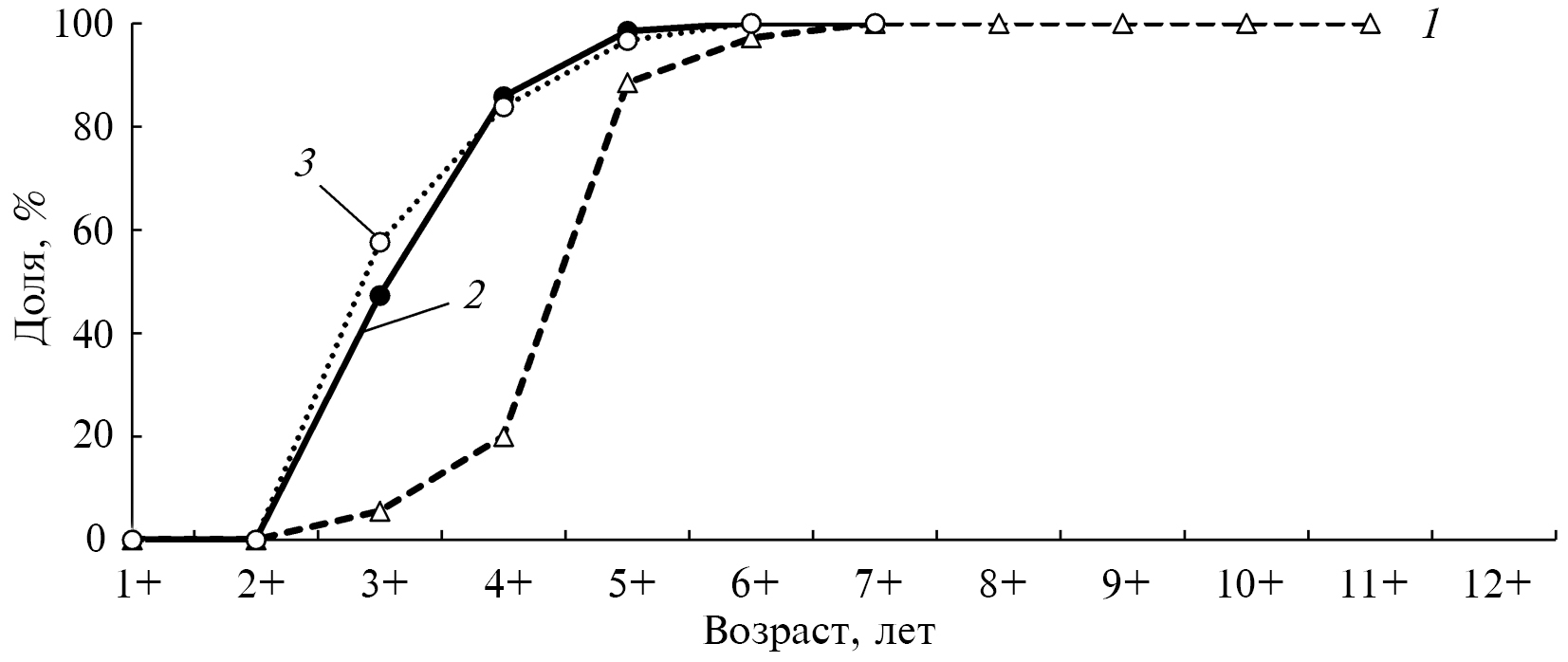 Рис. 6. Доля половозрелых рыб в возрастных группах европейского хариуса Thymallus thymallus р. Вымь из поколений, сформировавшихся в годы разных этапов функционирования популяции: 1 — 1972–1993, 2 — 2008–2012, 3 — 2015–2018.