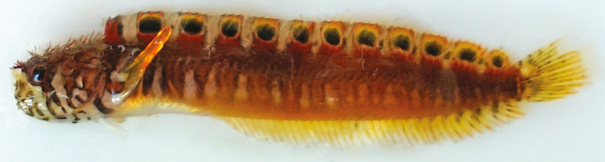 Общая длина (TL) пойманного экземпляра павлиньей мохоголовой собачки составила 47 мм. Поскольку это первый случай поимки в российских водах перешедшей к донному образу жизни особи данного вида, ниже приводим некоторые её диагностические признаки. Число лучей в спинном (LVII), анальном (I 42), грудных (12) и брюшных (I 4) плавниках и жаберных тычинок (7) на первой жаберной дуге почти соответствует их значениям у представителей вида из Северо-Восточной Пацифики (Mecklenburg et al., 2002). Жаберные мембраны соединены вместе и не прикреплены к межжаберному промежутку. Зубы на челюстях расположены в виде двух плотно сомкнутых рядов с единым режущим краем. На спинном плавнике хорошо заметны столь характерные для этого вида 12 тёмных глазчатых пятен, а на верхней части головы и рыле — многочисленные кожные выросты, небольшое количество которых имеется и на верхней части щёк (рис. 1). В связи с этим использованное в аннотированном каталоге “Рыбы морей России” (Парин и др., 2014) русскоязычное название этого вида — банальная мохоголовая собачка, на наш взгляд, выглядит явно неудачным, поскольку данная собачка повсеместно в Северо-Восточной Пацифике немногочисленна (Mecklenburg et al., 2002) и отличается довольно яркой окраской. Принимая во внимание характерные глазчатые пятна на спинном плавнике этого вида, чем-то напоминающие таковые на хвостах самцов павлинов (Pavo sp.), а также то, что его видовое название с латинского языка переводится как щёголь, с учётом рекомендации одного из рецензентов предлагаем дать ему русскоязычное название — павлинья мохоголовая собачка.