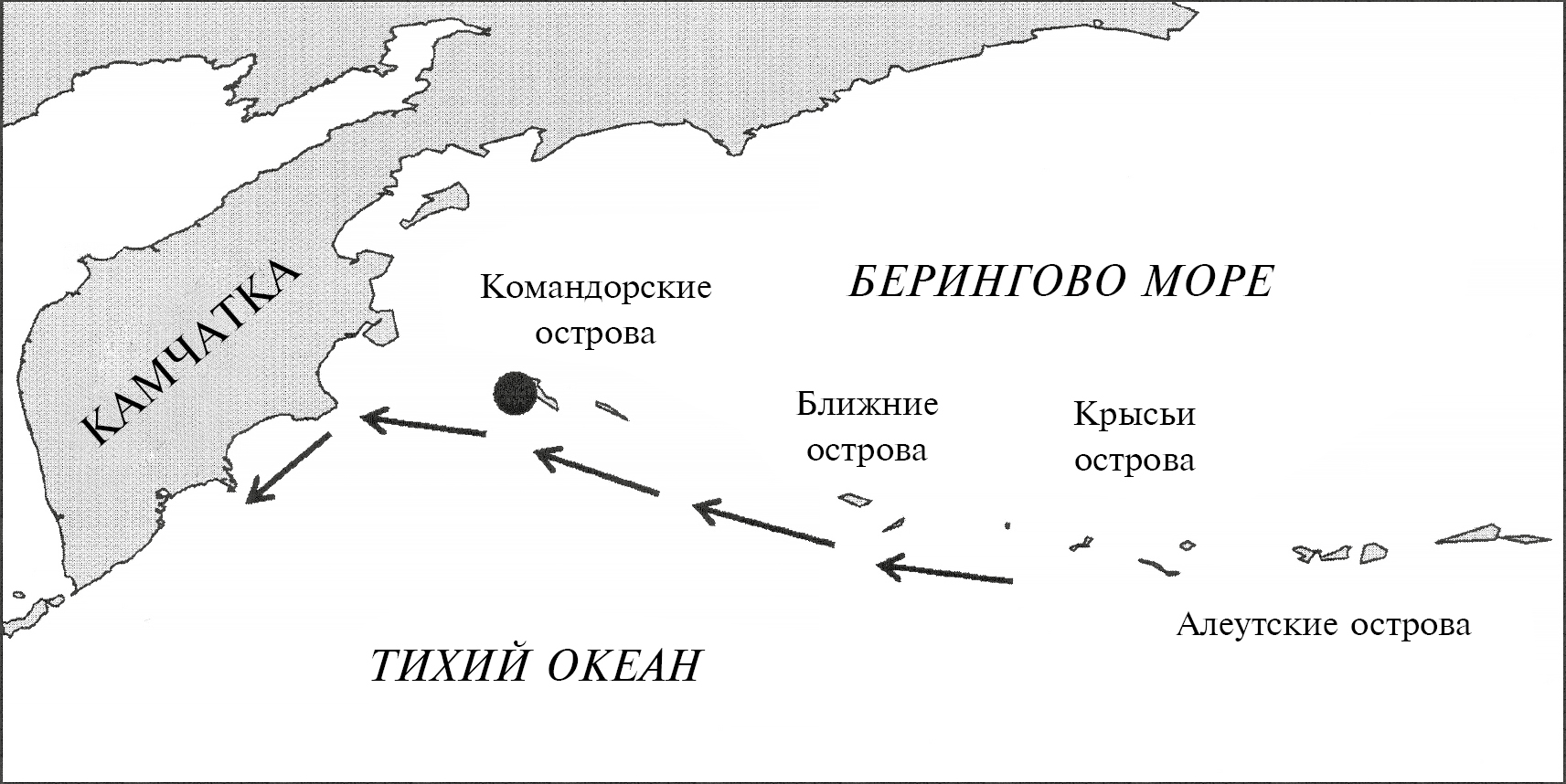 Рис. 2. Направление (←) возможного переноса пелагических личинок павлиньей мохоголовой собачки Chirolophis nugator Алеутским течением в западном направлении из района Ближних или Крысьих о-вов Алеутского архипелага к побережью о-ва Беринга: (⏺) — место поимки особи этого вида.