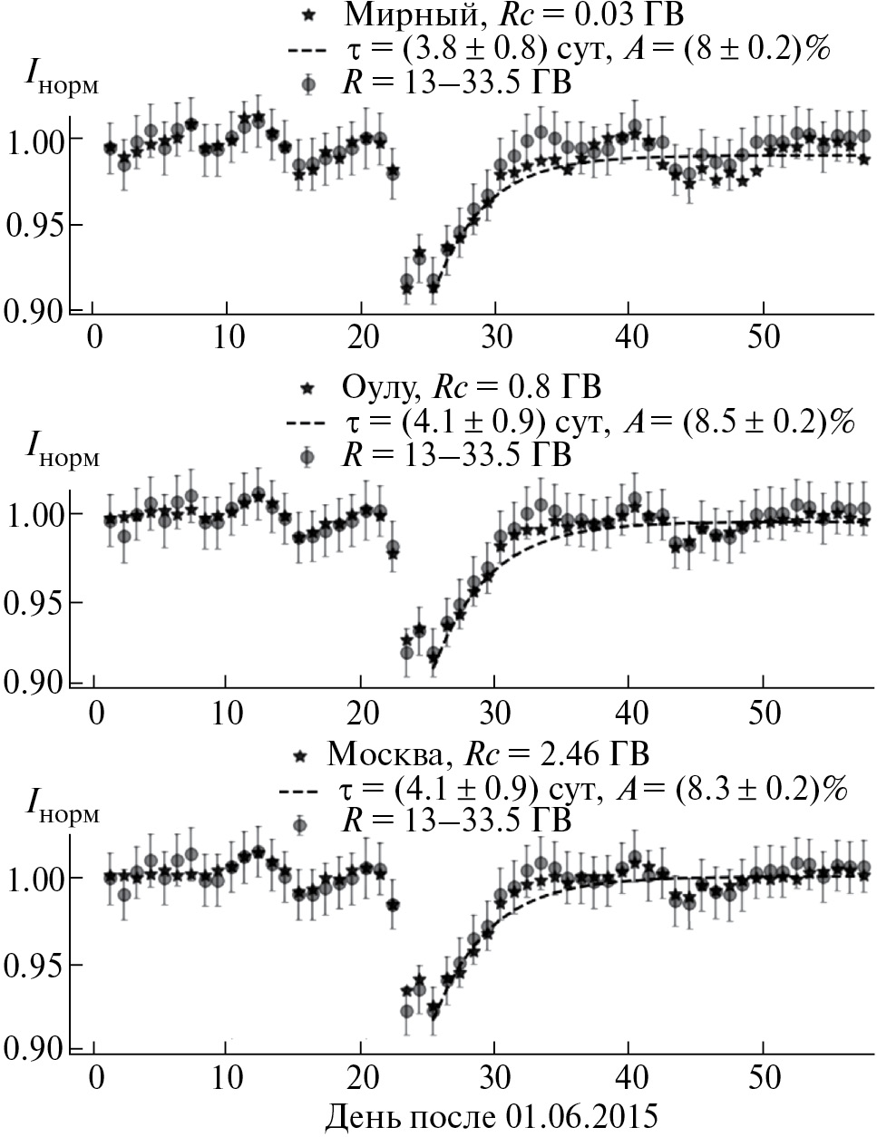 На рис. 4 показаны нормированные темпы счета трех нейтронных мониторов: Москва, Оулу и Мирный, в сравнении c нормированным потоком протонов, зарегистрированным спектрометром АМS-02 в диапазоне жесткости 13–33.5 ГВ. Как видно из рисунка, амплитуды и время восстановления ФП, вычисленные по данным нейтронных мониторов, хорошо согласуются с потоком космических протонов с жесткостью >10 ГВ.