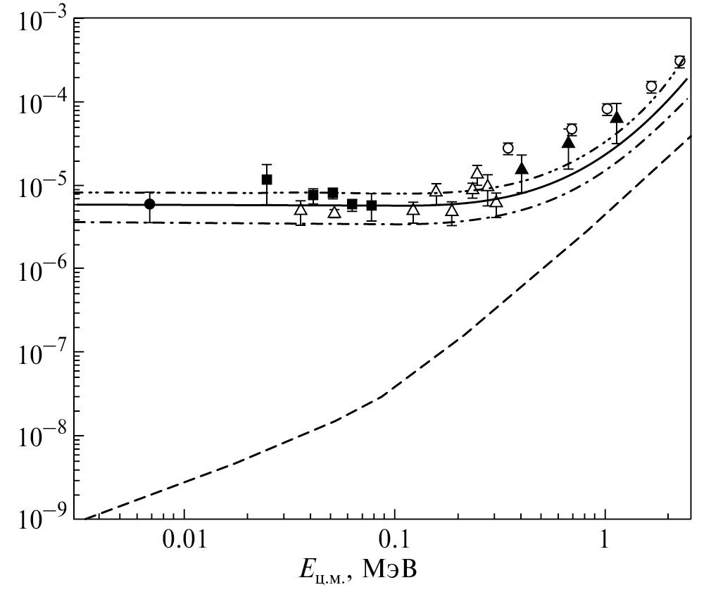 Полный астрофизический S-фактор реакции 2H(d, γ)4He, вычисленный в МКПОП, показан на рис. 1 как функция энергии относительного движения Eц.м сталкивающихся дейтронов в системе центра масс. Экспериментальные данные, представленные на рис. 1, извлечены из измерений [2—6]. Расчеты выполнены со следующими значениями интенсивности тензорного взаимодействия gt: 0 (штриховая кривая), 1.21 (штрихпунктирная с одной точкой кривая), 1.39 (сплошная кривая) и 1.5 (штрихпунктирная с двумя точками кривая). Ненулевые значения интенсивности gt выбраны таким образом, чтобы воспроизвести в пределах погрешностей экспериментальное значение кэВ бн при кэВ из работы [6].
