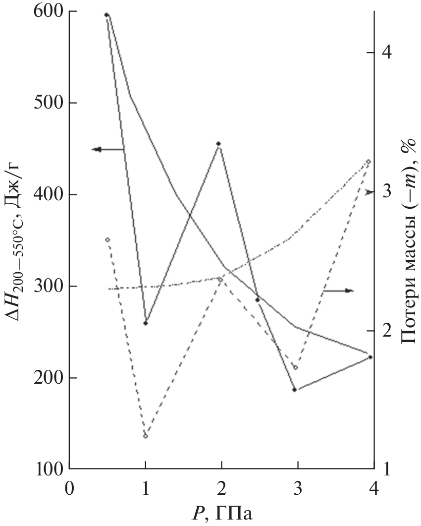 Thermally stimulated processes in mixtures of boric acid (BA) with aluminum after plastic deformation under a pressure of 0.5–4.0 GPa were studied by differential scanning calorimetry (DSC) and thermogravimetry. In the original BC, in the range of 20–200°C, splitting of water occurs, accompanied by an endothermic effect. In deformed mixtures BC–Al = 50–50, the endoprocess was recorded on DSC thermograms in the range of 20–200°С, an exoprocess in the range of 200–550°С, an aluminum-oxidation exoprocess at 620°С, and an aluminum melting endoprocess at 656°С. The baric dependences of the parameters of thermal processes in deformed mixtures exhibited extrema at pressures of 1.0 and 2.5 GPa, which were associated with changes in the electronic structure of aluminum caused by high pressure. Such changes can be retained in deformed mixtures after completion of pressure treatment and manifest themselves upon heating due to the formation of electrical double layers in mixture samples.