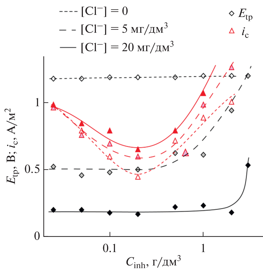 The potentiodynamic method was used to study the influence of the cadmium complex of nitrilo-tris-methylenephosphonic acid Na4[Cd(H2O)N(CH2PO3)3]·7H2O on the corrosion-electrochemical behavior of low-carbon steel in neutral aqueous media in the presence of Cl ions-. The composition and structure of passive films formed at different potentials and composition of the medium were studied by X-ray photoelectron spectroscopy with layer-by-layer etching. When the content of Cl– ions up to 20 mg/dm3 Na4[Cd(H2O)N(CH2PO3)3]·7H2O at a concentration of 0.025–1.00 g/dm3 acts as a corrosion inhibitor, reducing the current density of anodic dissolution of the metal, and, at a concentration of more than 1.00 g/dm3, encouraging corrosion. The minimum corrosion rate is achieved at a concentration of Na4[Cd(H2O)N(CH2PO3)3]·7H2O 0.15 g/dm3 regardless of the concentration of Cl– ions. At Cl– ion concentrations of 50 mg/dm3 and more, Na4[Cd(H2O)N(CH2PO3)3]·7H2O is ineffective as a corrosion inhibitor.