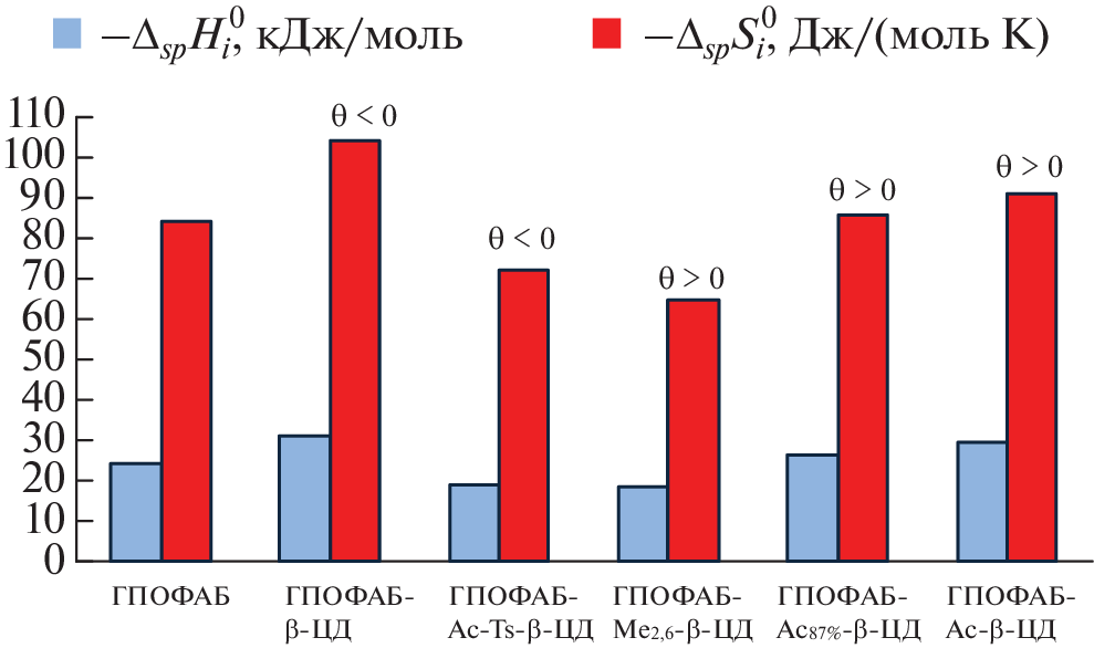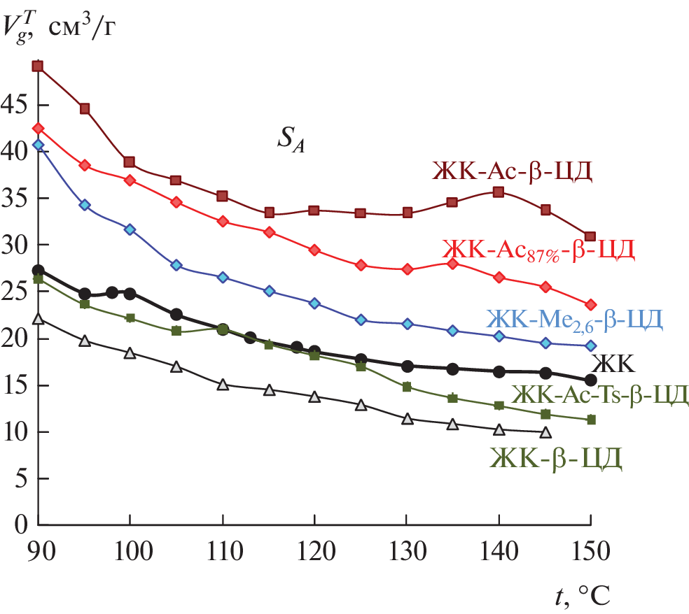Using gas chromatography, we studied the influence of the nature of substituents in the β-cyclodextrin (CD) molecule on the sorption properties and the possibility of complex formation with the macrocycle of 26 organic compounds (hydrocarbons and alcohols) in binary sorbents based on the smectic–nematic supramolecular liquid crystal 4-(3-hydroxypropyloxy)-4'-formylazobenzene (HPOFAB) and four derivatives β-CD. It has been established that the nature of the substituents in the β-CD molecule significantly affects the manifestation of solvation interactions between LC and macrocyclic additive and, as a consequence, the mesomorphic, sorption, and selective properties of the studied composite sorbents.