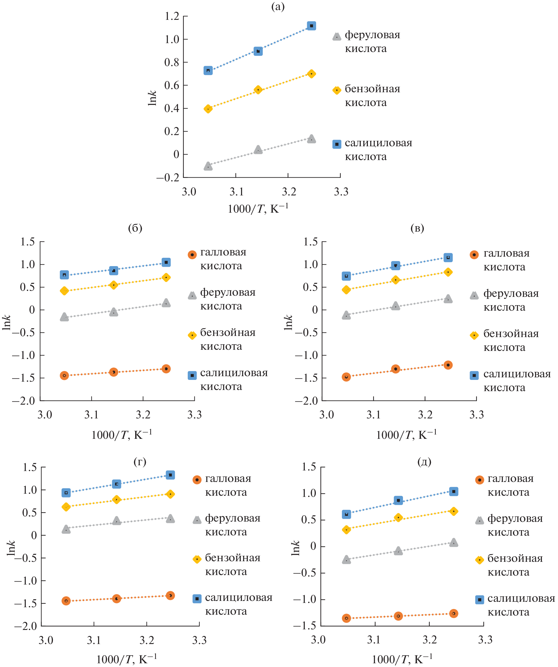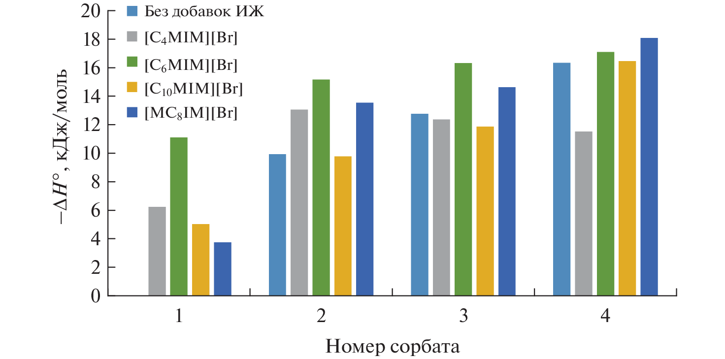Using reverse-phase high-performance liquid chromatography, some features of the chromatographic retention of polar aromatic acids (gallic, ferulic, benzoic, and salicylic) on hexadecylsilica gel from aqueous-acetonitrile eluents containing imidazolium ionic liquids (ILs) were studied. The following ILs were used: 1-butyl-3-methylimidazolium bromide [C4MIM][Br], 1-hexyl-3-methylimidazolium bromide [C6MIM][Br], 1-decyl-3-methylimidazolium bromide [C10MIM][Br], and 1-methyl-3-octylimidazolium bromide [MC8IM][Br]. The dependences of retention on the structure of imidazolium ILs and aromatic acids were studied. Based on the temperature dependences of the retention factor, the thermodynamic characteristics of the sorption process (standard enthalpy and entropy component) were calculated. The obtained thermodynamic characteristics of sorption were analyzed, and the influence of the structure of the IL and sorbate on their values was shown. The compensation relationships between the enthalpy and the entropy component of the sorption of the studied aromatic acids were analyzed.