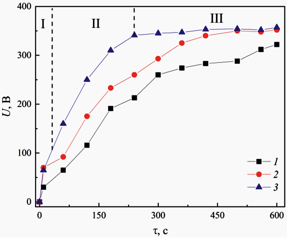 Рис. 3. Хронограммы напряжения ПЭО сплава WE43 в пирофосфатном электролите: Плотность тока ПЭО, А/дм²: 1 - 20; 2 - 30; 3 - 40.