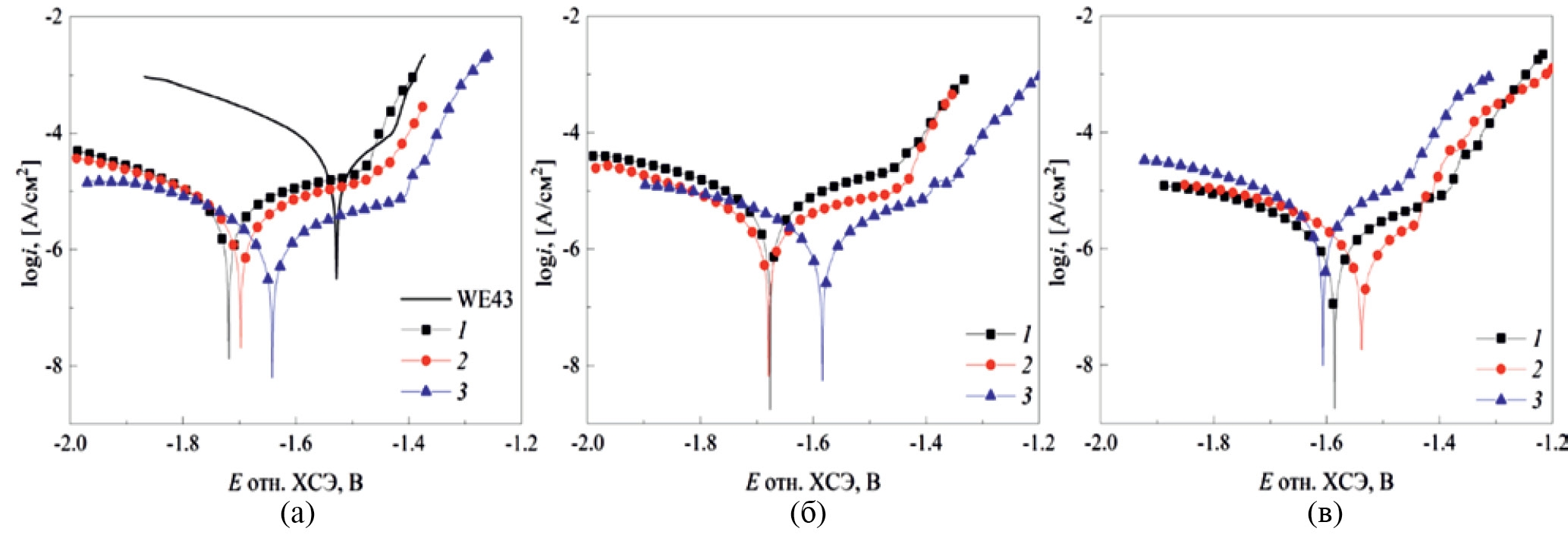 Электрохимические исследования коррозии полученных образцов проводили на потенциостате/гальваностате Autolab PGNST 302N в трехэлектродной ячейке с нижним креплением рабочего электрода. Коррозионной средой служил раствор Хэнкса (pH 7.4) следующего состава, г/дм³: NaCl – 8; KCl – 0.2; CaCl₂ – 0.14; MgSO₄×7H₂O – 0.1; MgCl₂∙7H₂O – 0.10; Na₂HPO₄×2H₂O – 0.06; KH₂PO₄– 0.06; NaHCO₃ – 0.35. Активная площадь рабочего электрода составляла 1 см². В качестве электрода сравнения использовали насыщенный хлоридсеребряный электрод, а противоэлектрода – платиновую проволоку. Поляризационные кривые снимали в диапазоне потенциалов от –200 до +500 мВ относительно стационарного потенциала при линейной скорости развертки потенциала 0.001 В/с. Время установления стационарного потенциала – 30 мин. Токи коррозии рассчитывали по пересечению прямолинейных тафелевских участков катодных и анодных кривых при поляризации больше ±50 мВ. Спектры электрохимической импедансной спектроскопии регистрировали в диапазоне частот от 10⁵ до 10⁻² Гц с амплитудой переменного напряжения 10 мВ. Анализ спектров, подбор эквивалентных схем и расчет параметров их элементов проводили с использованием программного обеспечения ZView 3.2. Температура раствора во всех опытах составляла 37 ± 0.5°С. Измерение pH раствора после коррозионных испытаний проводили с помощью автотитратора TitroLine easy.